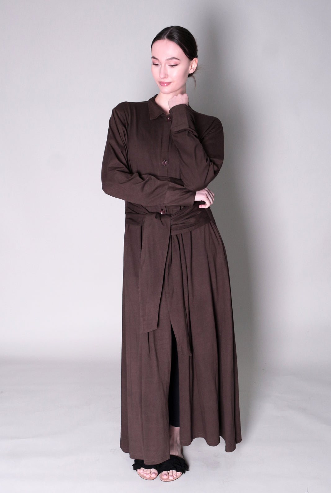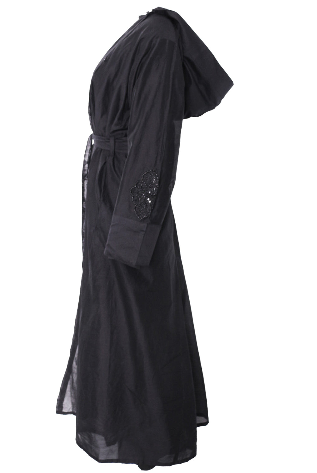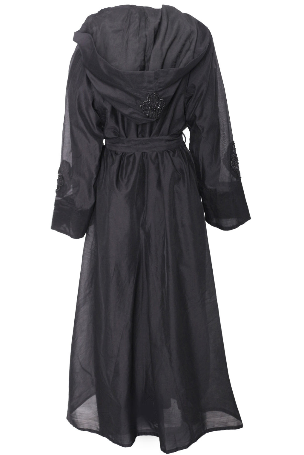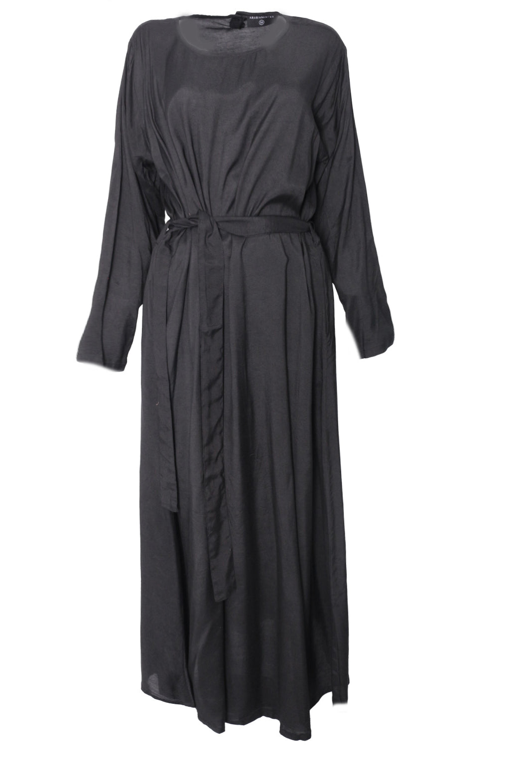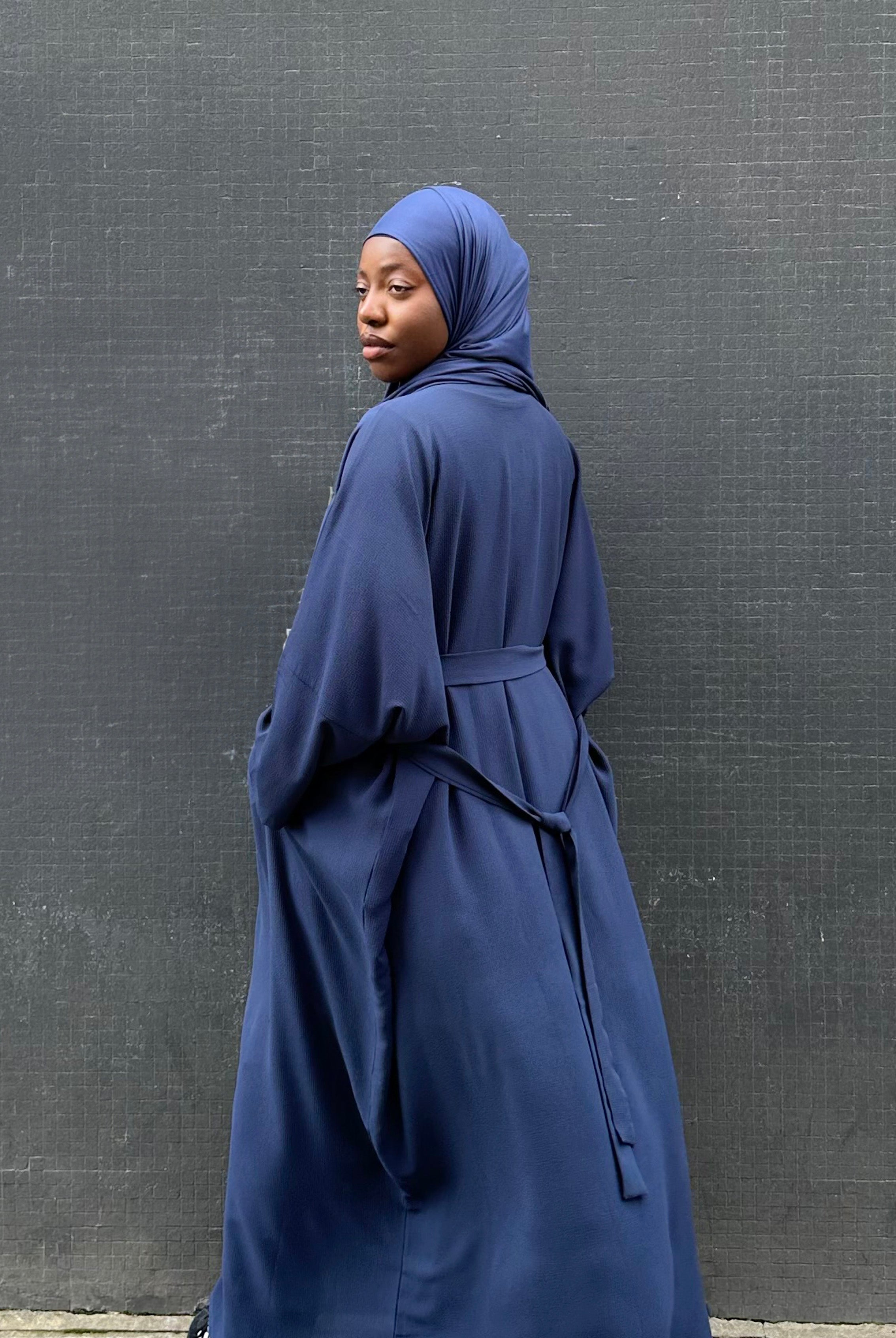 Lovely quality material. A generous width and love that the belt is extra long! Everything about it is lovely and convenient. Not only can it be worn as open or closed Abaya but also has pockets! Material is not thin but a medium thickness. Haven’t washed it yet so can’t tell how it is after wash.