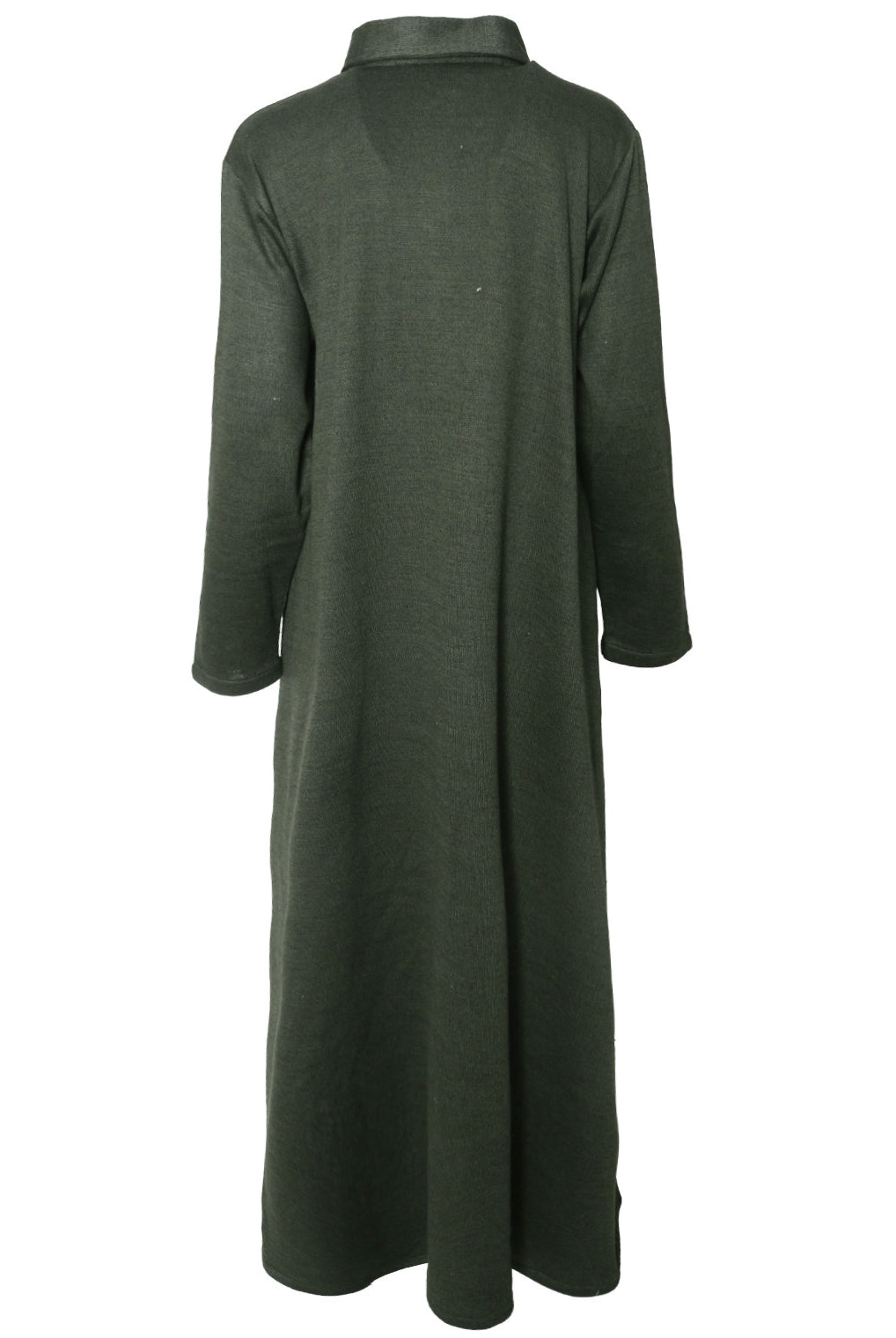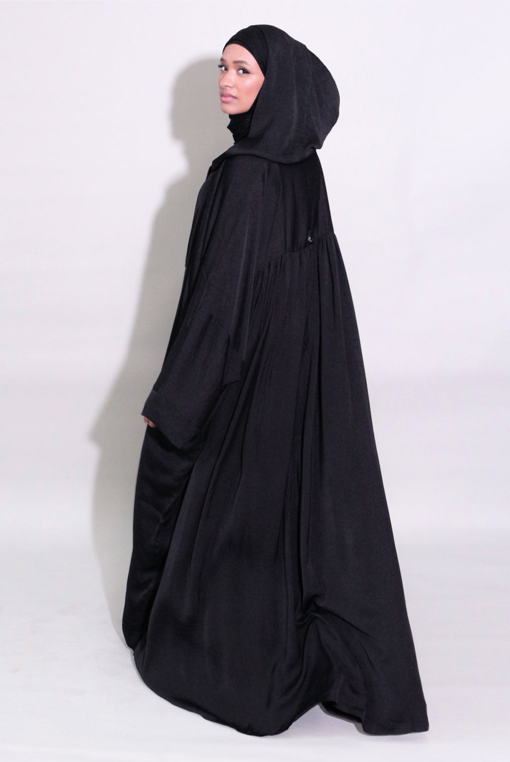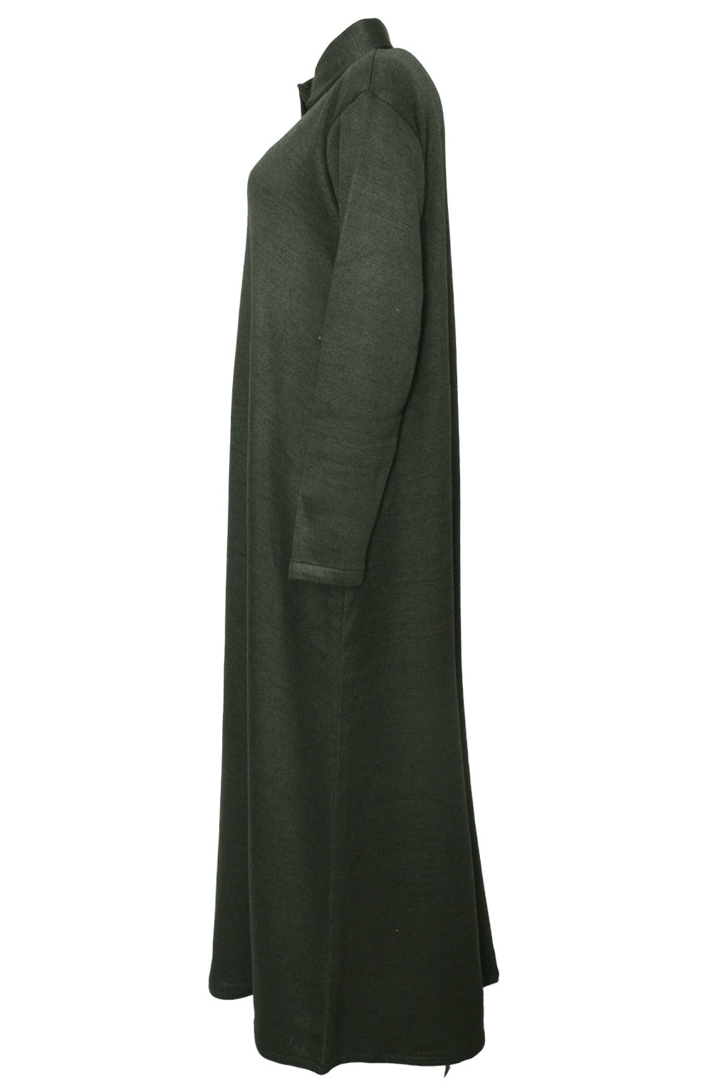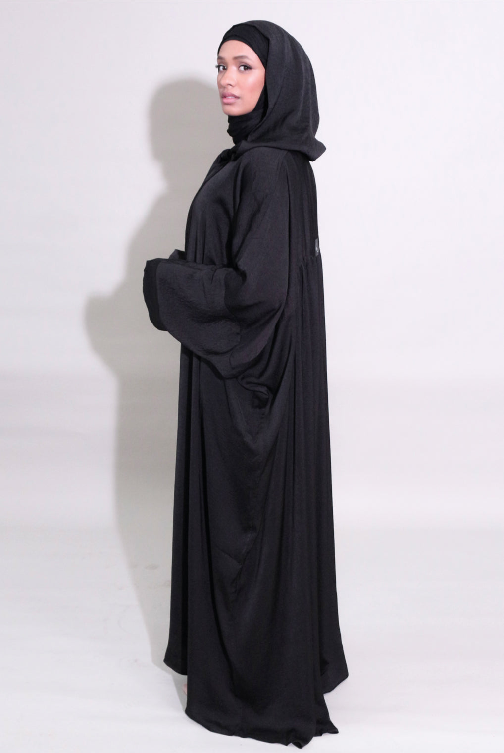 Lovely quality material. A generous width and love that the belt is extra long! Everything about it is lovely and convenient. Not only can it be worn as open or closed Abaya but also has pockets! Material is not thin but a medium thickness. Haven’t washed it yet so can’t tell how it is after wash.