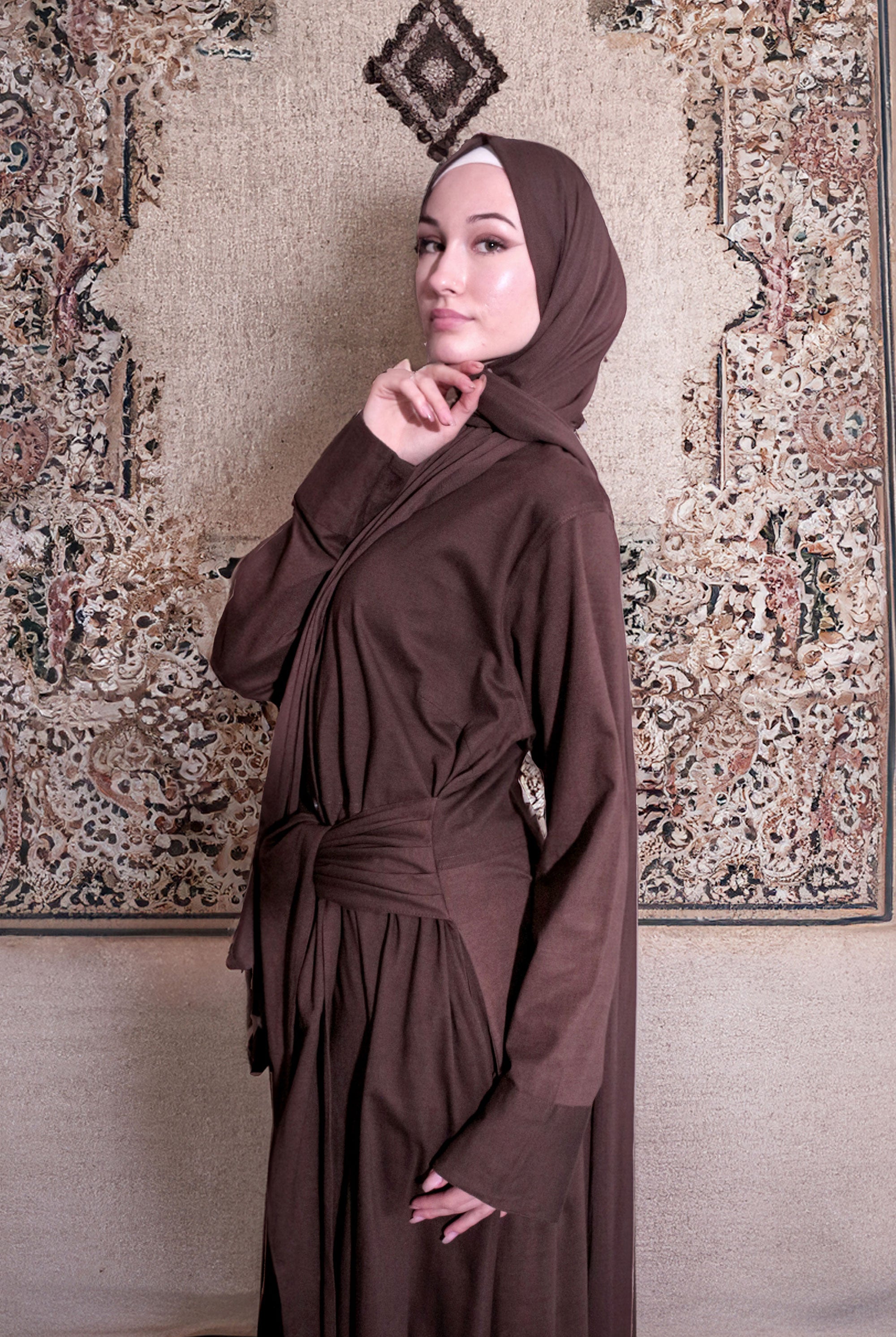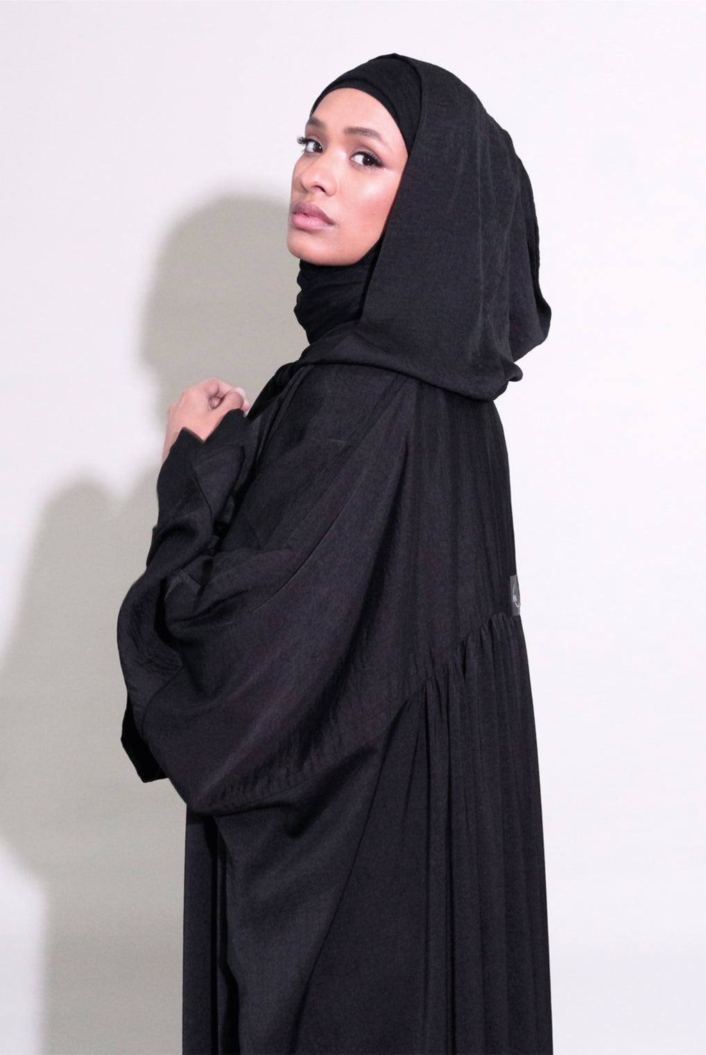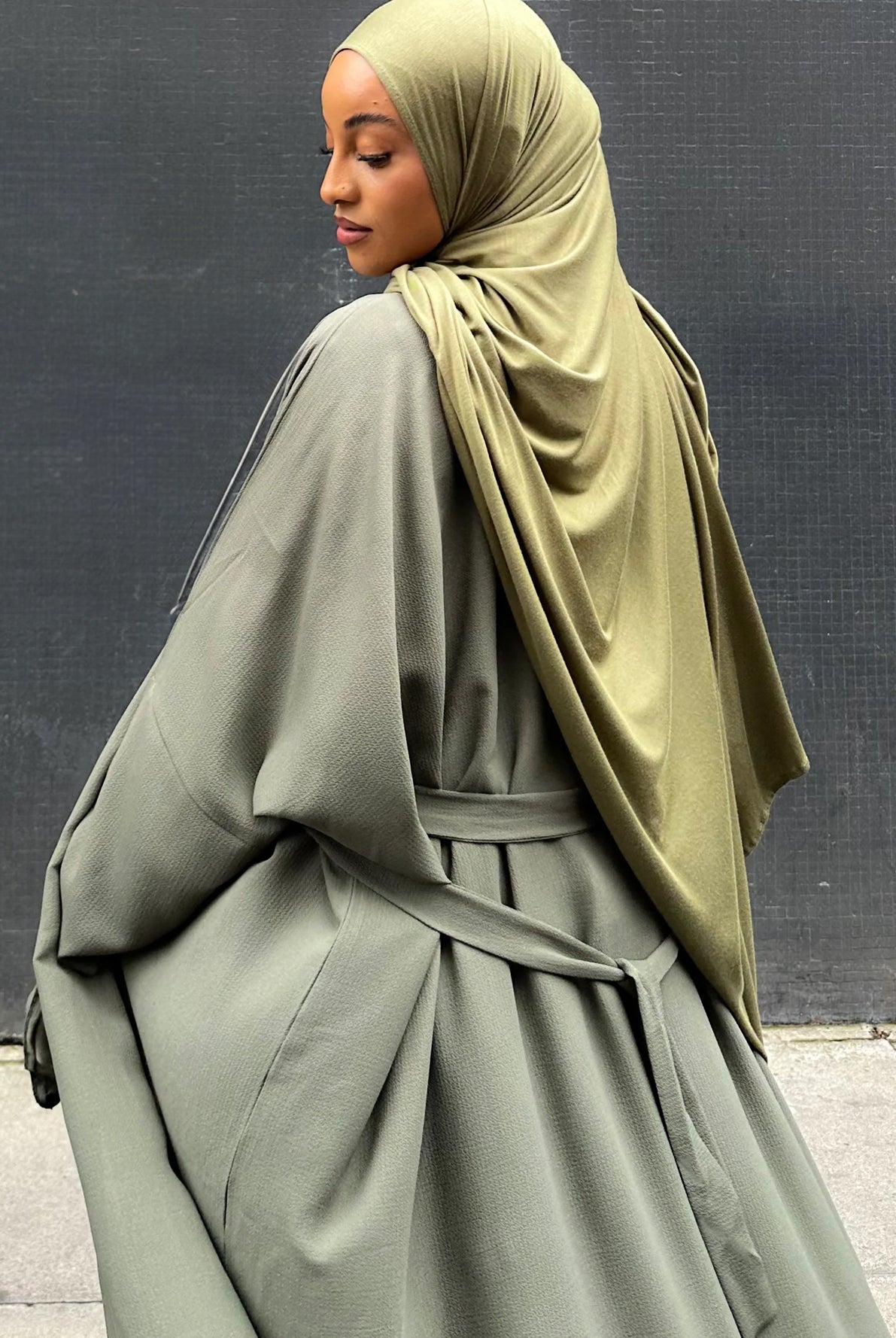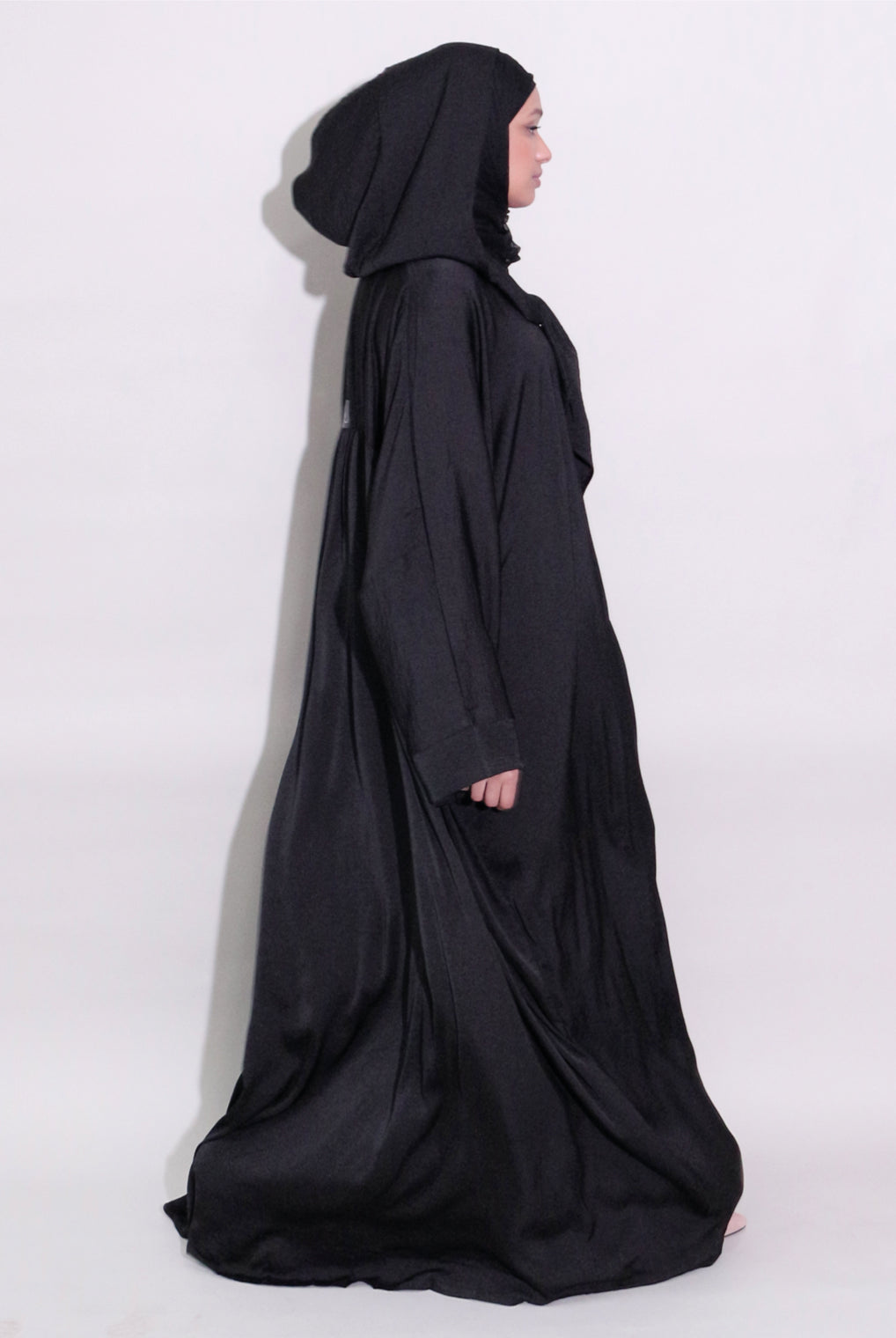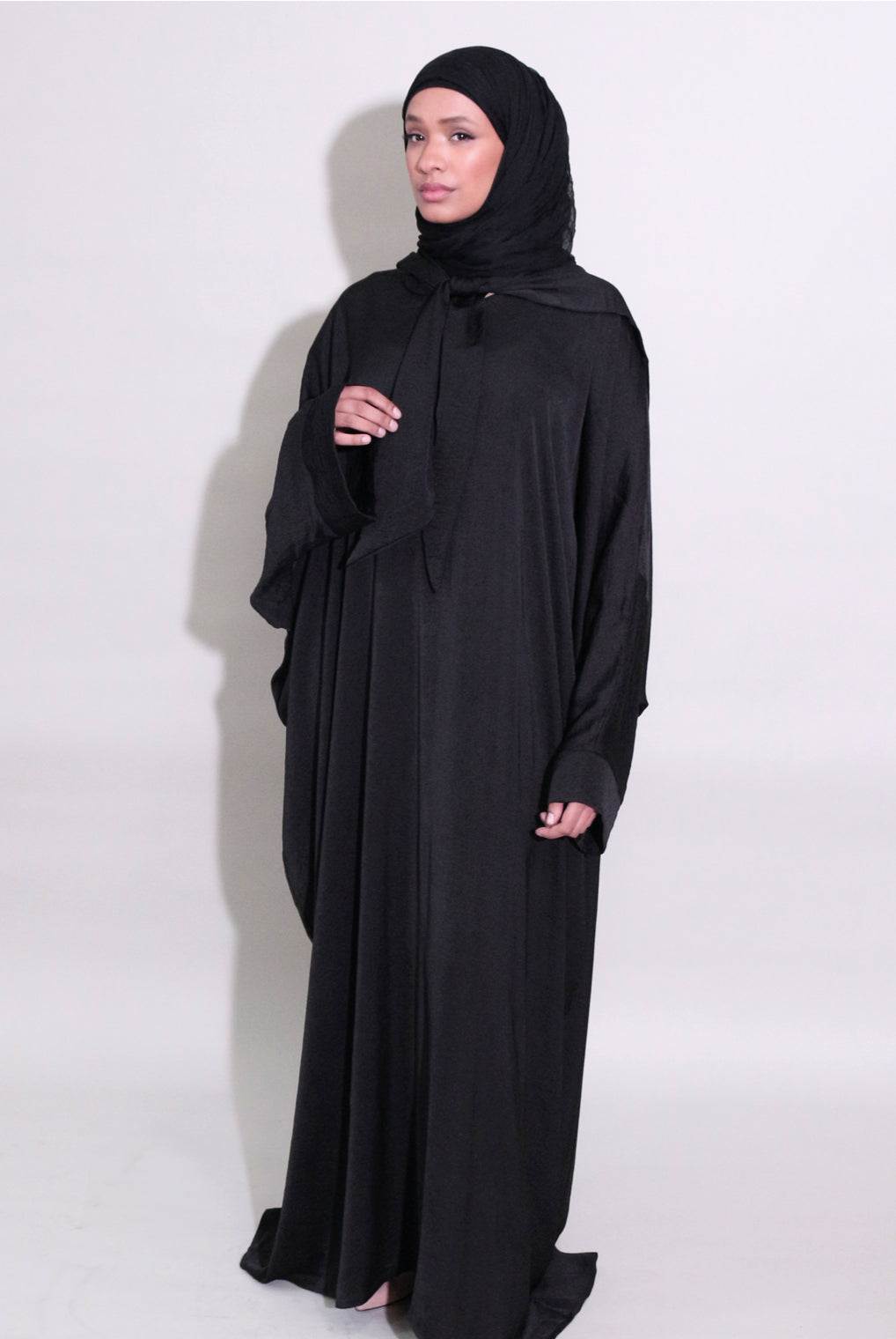 Lovely quality material. A generous width and love that the belt is extra long! Everything about it is lovely and convenient. Not only can it be worn as open or closed Abaya but also has pockets! Material is not thin but a medium thickness. Haven’t washed it yet so can’t tell how it is after wash.