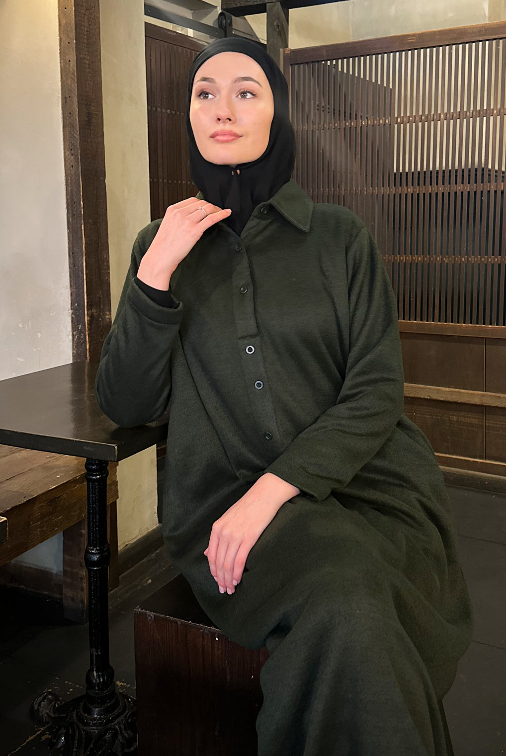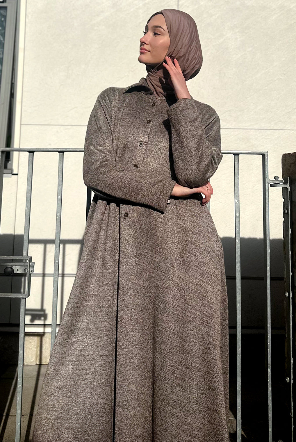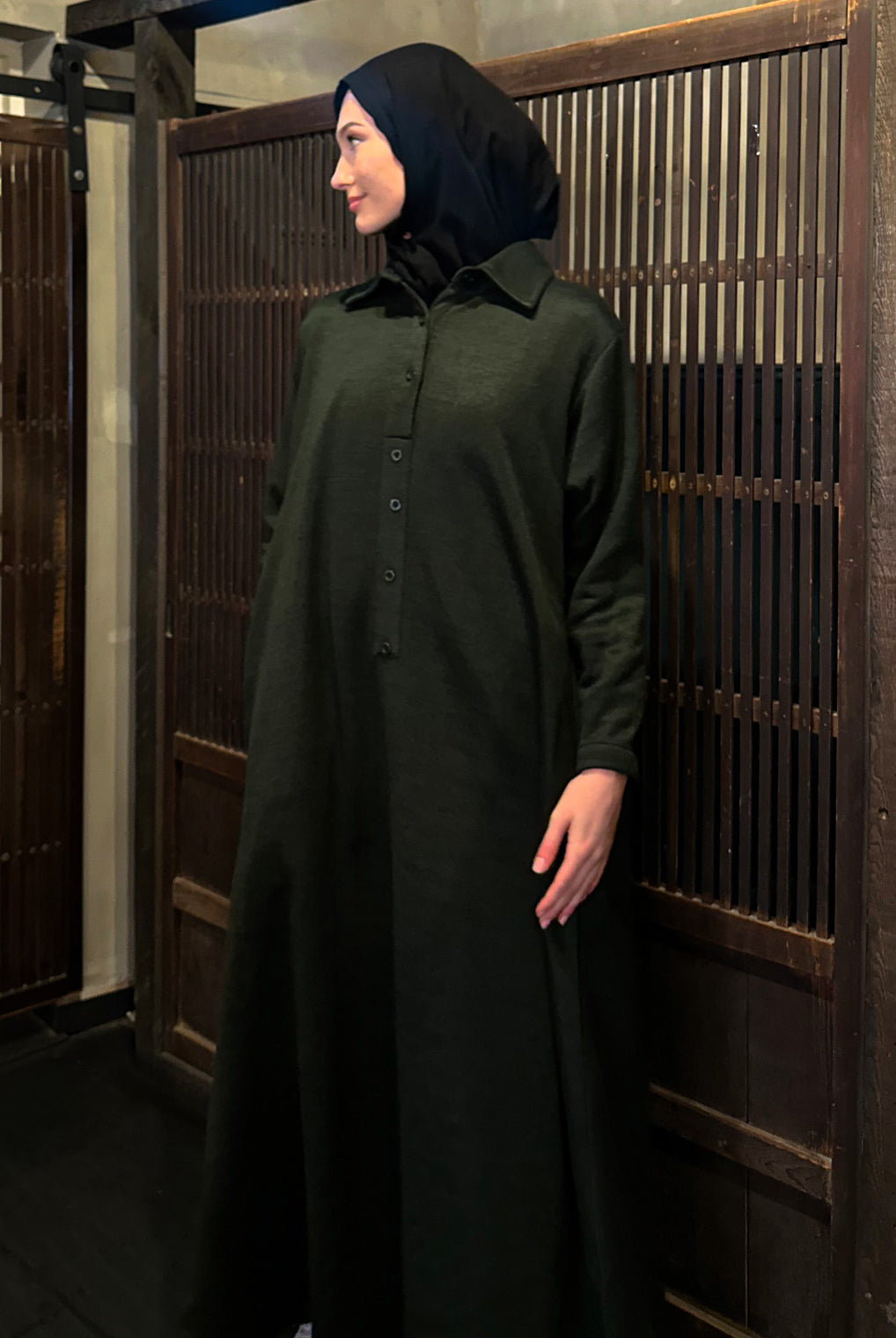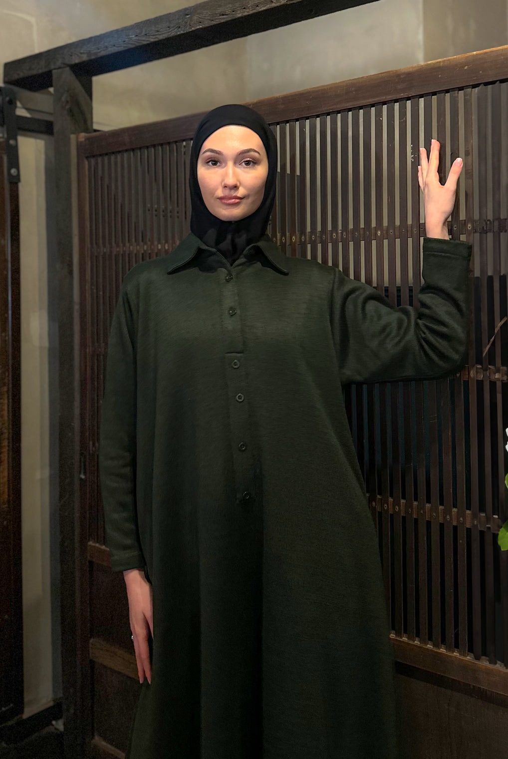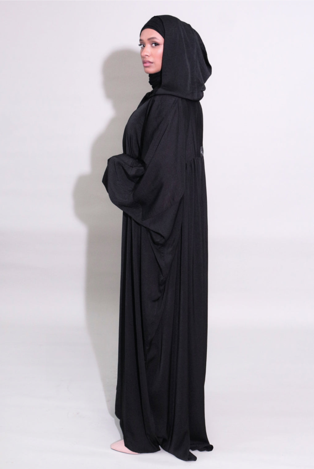 Lovely quality material. A generous width and love that the belt is extra long! Everything about it is lovely and convenient. Not only can it be worn as open or closed Abaya but also has pockets! Material is not thin but a medium thickness. Haven’t washed it yet so can’t tell how it is after wash.