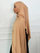 This instant sand jersey hijab features soft, stretchy fabric pre-shaped to fit comfortably around your face. It requires no pins or complex styling—just slip it on for a polished look. Lightweight and breathable, it ensures comfort and modesty throughout your day, making it ideal for both busy schedules and active wear.