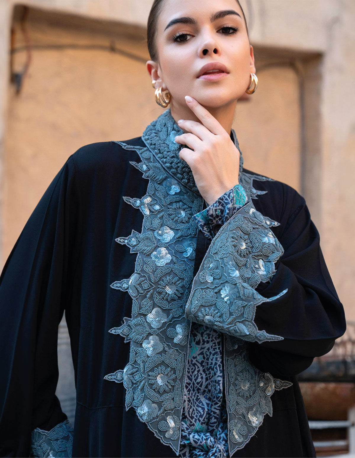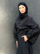 Each delicate motif echoes the intricate designs of Persian manuscripts and the grandeur of Safavid textiles. Our Naseej Black Jacket is a structured fabric, with a little stiffness that creates an elegant silhouette, with a belt to cinch in at the waist, buttons to wear it closes and with side pockets