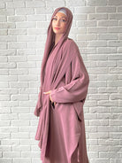 This kaftan offers a luxurious satin texture, ideal for daily wear with ease of movement and a minimalist design. It features a front zipper and convenient front pockets. Designed in a free-flowing style, it does not include a belt at the back, enhancing its elegant simplicity.