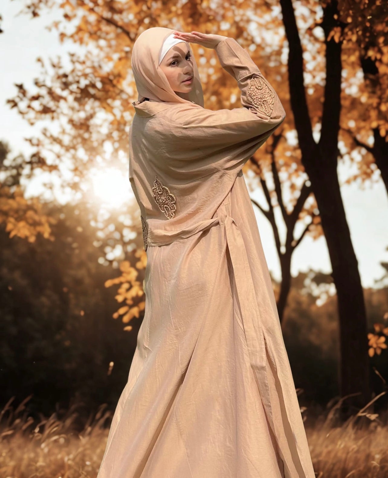 Our Cinnamon Silk Persia Jacket is a structured fabric, with a little stiffness that creates an elegant silhouette. With a belt to cinch in at the waist and voluminous kimono sleeves. It has our signature Persia motif in tonal colour to give it a vintage-style elegance.