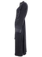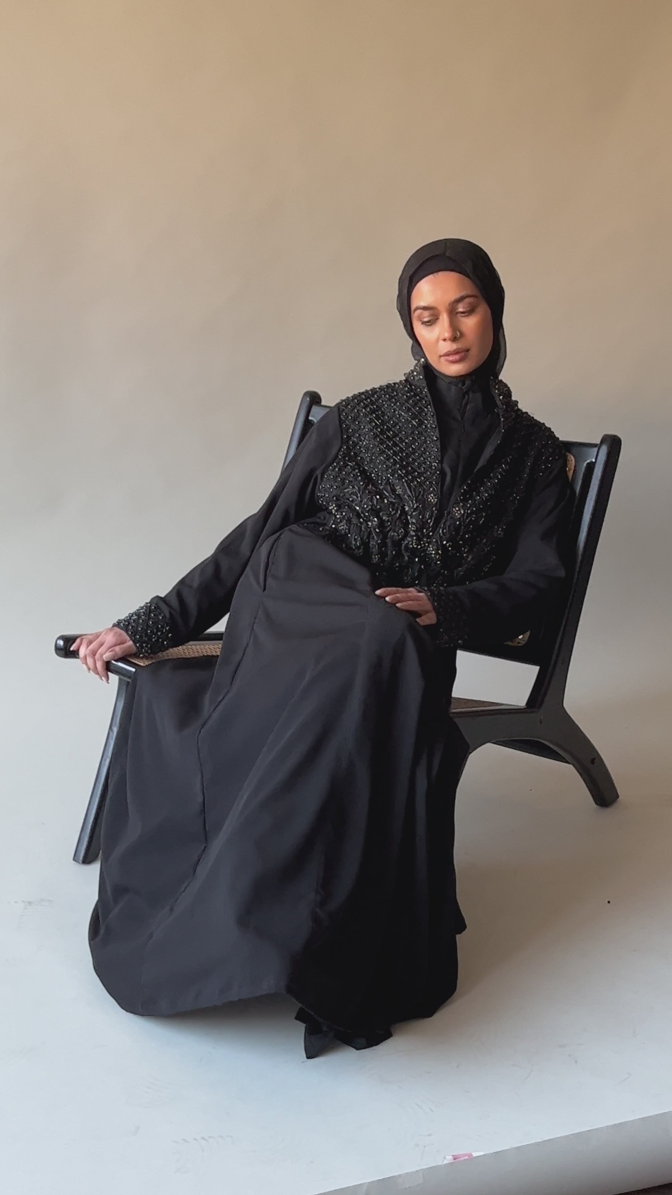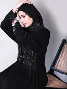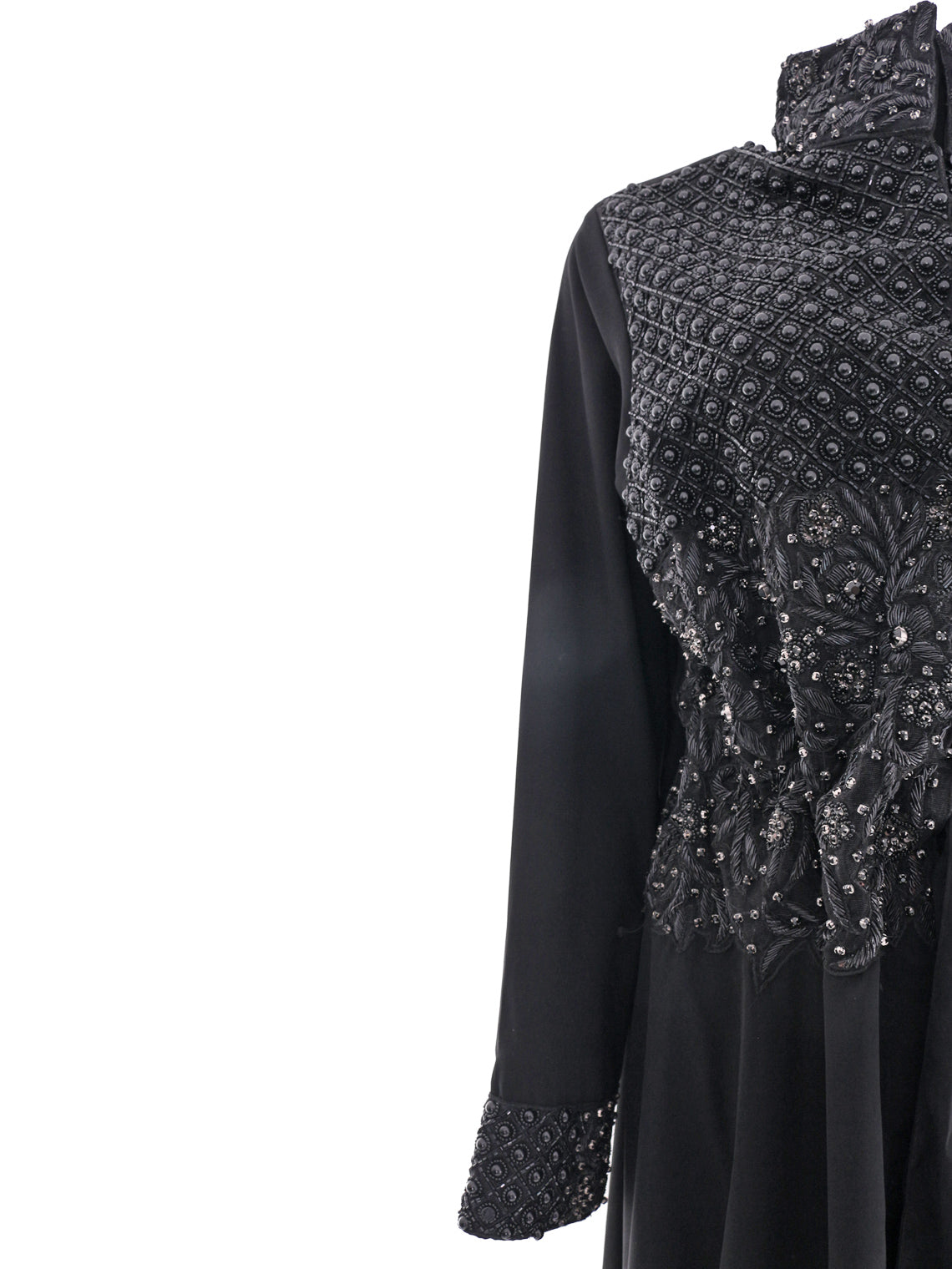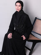 Handcrafted with inspiration from tales of regal opulence, the Aaria Black Jacket exudes confidence and empowerment. Traditional heritage embroidery adorned with beads and pearls, expertly cinched and gathered at the waist to create a delicate balance between structure and fluidity, accentuating the feminine form. The abundance of black details and pearl beading on the wrist evokes the opulent world of Arabian mirages. Drawing from the cultural richness and ancient artisanal finesse, this jacket is a testament to the love for handcrafted work.