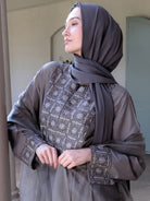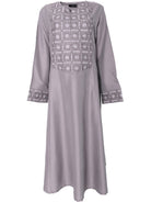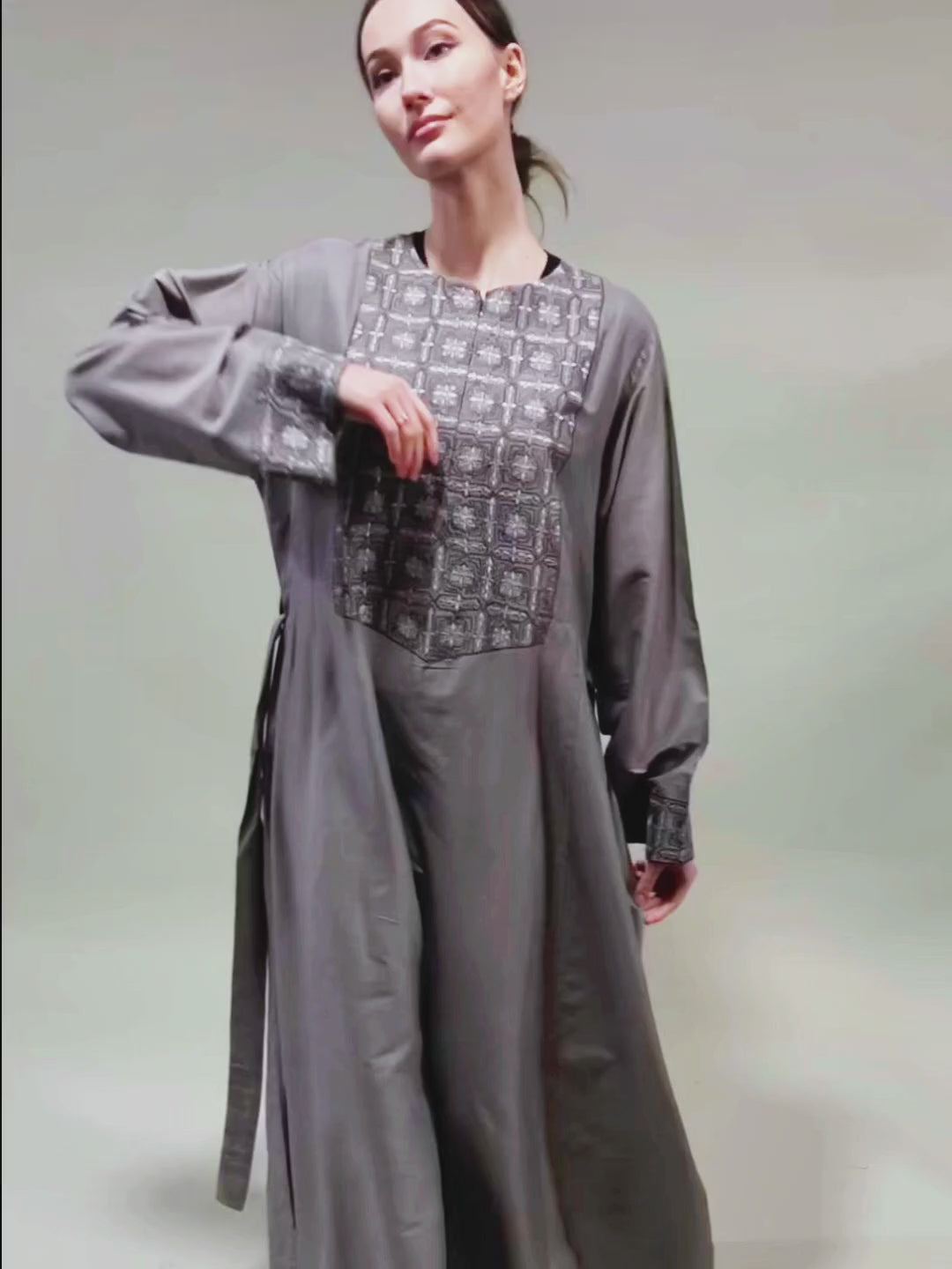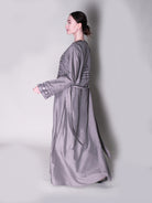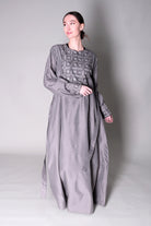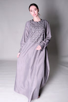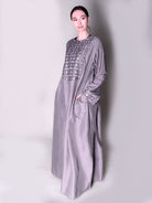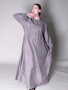 Blending elements from two eras, the Grey Aaina Embroidery Dress presents a distinctive masterpiece of elegant craftsmanship. Crafted from breathable cotton silk, it features detailed embroidery in subtle tonal shades and a belt that can be adjusted for a flattering fit. This long-sleeved design offers practical side pockets alongside a matching self-tie belt, marrying style with utility. Created through a slow fashion process, each dress is a singular piece, perfect for those who appreciate refined and timeless wardrobe additions.
