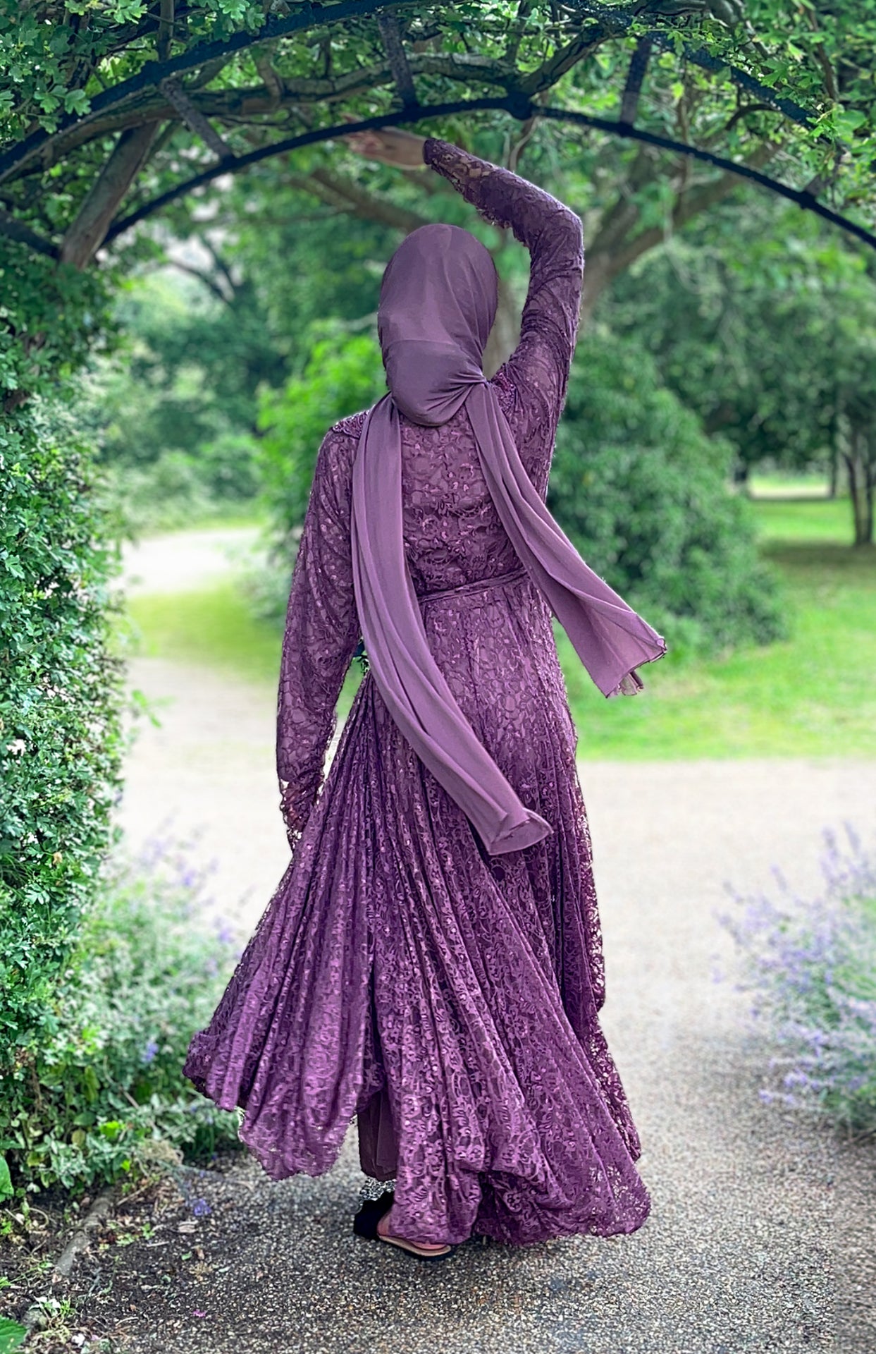 Indulge in the timeless elegance of 'Le Chute', a beloved piece from Arabian Nites. This enchanting design features delicate floral lace fabric with intricate patterns, adding charm and allure. It also includes side pockets and a belt for a touch of uniqueness.