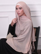 This hijab features a delicate, warm peach shade that enhances any outfit with subtle elegance. Crafted from luxuriously soft and breathable modal fabric, it offers superior comfort and style. Its elegant drape is perfect for everyday wear or more formal events. Finished with precise edge stitching, each scarf boasts a polished and durable look that blends sophistication with lasting quality.
