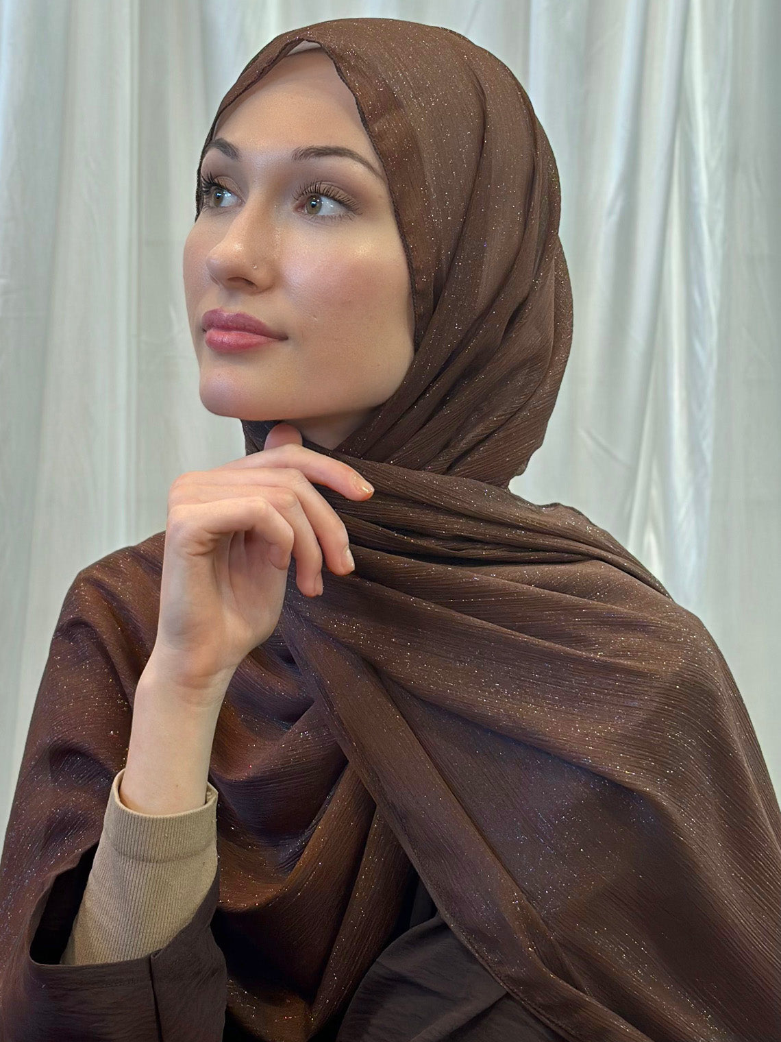 The Coco Shimmer Hijab is a chic and opulent adornment that brings a touch of glitz to any look. Made from a sumptuous, ethereal chiffon material. Effortlessly versatile: The chiffon's lightweight and fluid properties make it effortless to style in multiple ways, encouraging individuality and imagination.