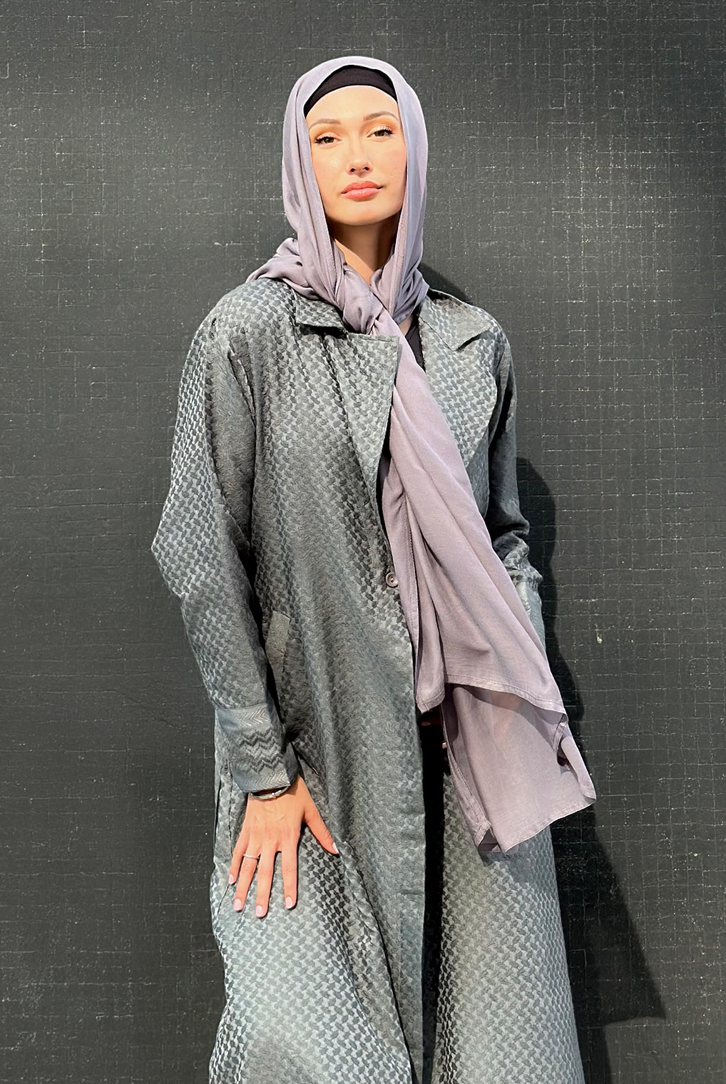With a little stiffness that creates an elegant silhouette. With a belt to cinch in at the waist and voluminous kimono sleeves. It has our signature Persia motif in tonal colour to give it a vintage-style elegance.