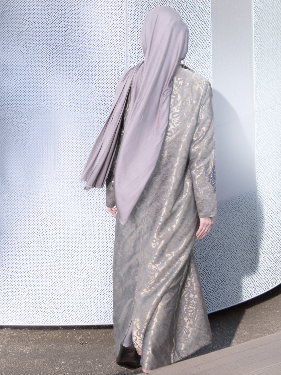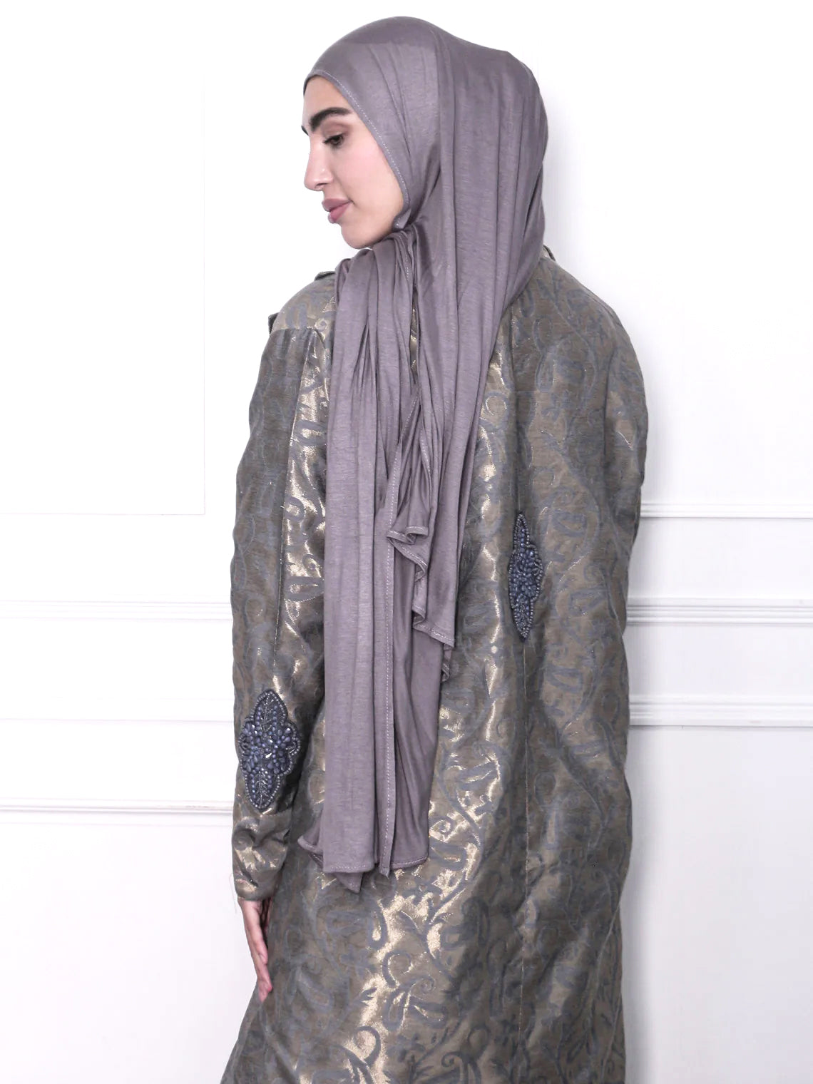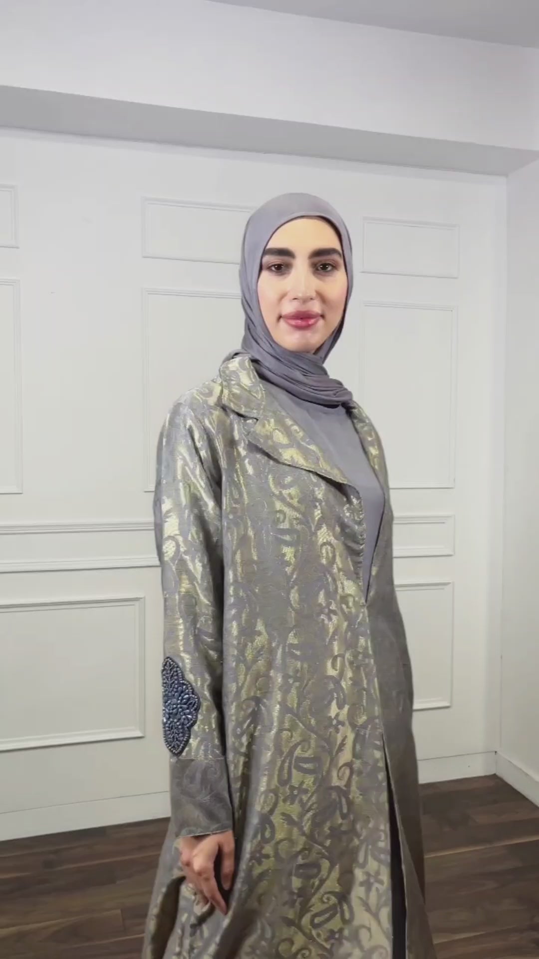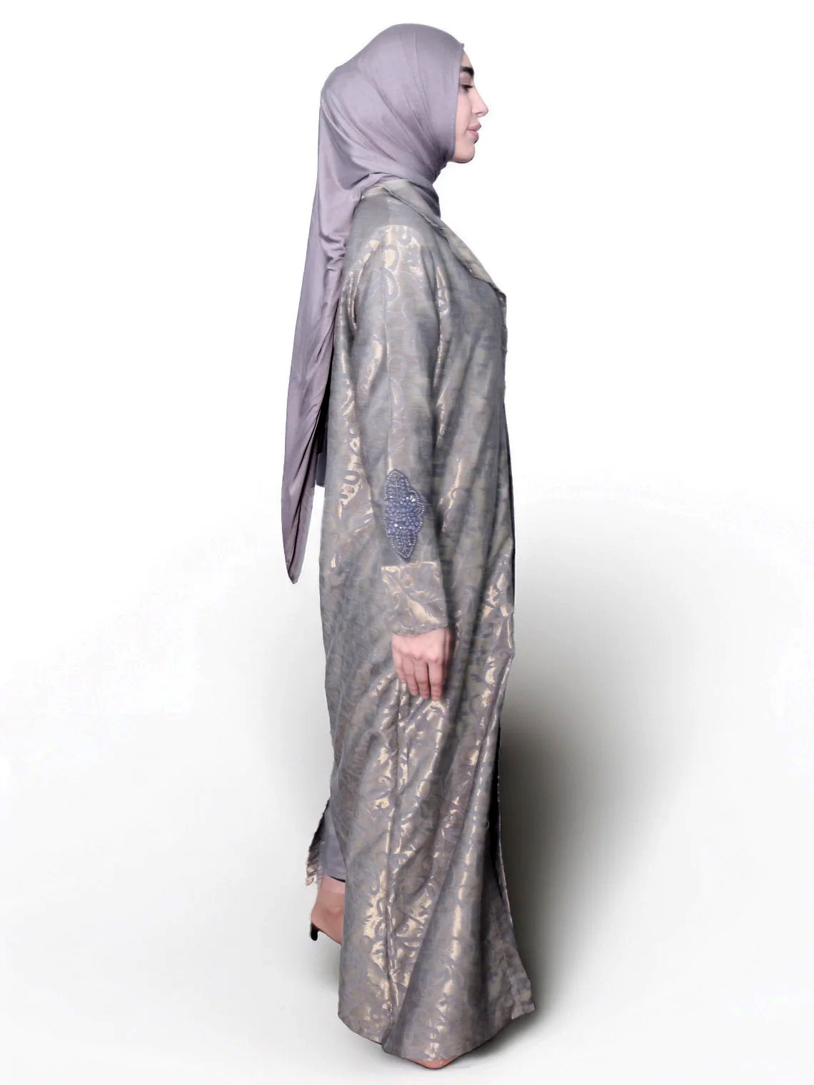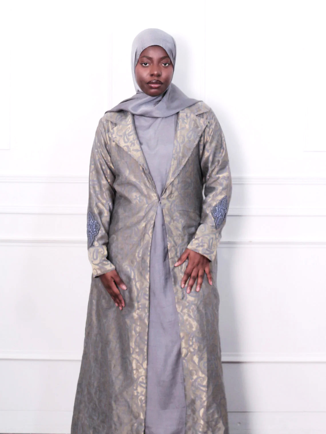 A delicate, jacquard with a woven tonal gold pattern, offering a lightweight drape and soft texture. Finished with hand embroidery on the sleeves for added elegance. Comes with a little slit at the back.