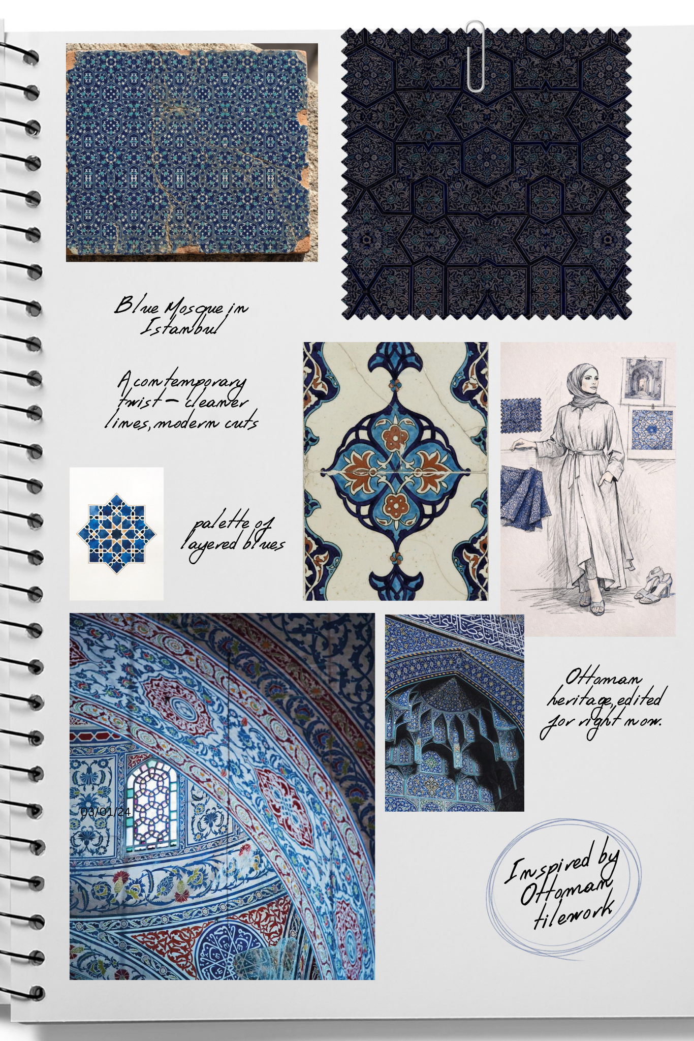 A blue toned ode to Ottoman ceramics, reimagined in wearable silhouettes. Inspired by the iconic Iznik tiles of Istanbul and the Blue Mosque's legacy of light, geometry, and devotion, the edit translates classical patterns through a modern, modest lens.