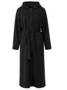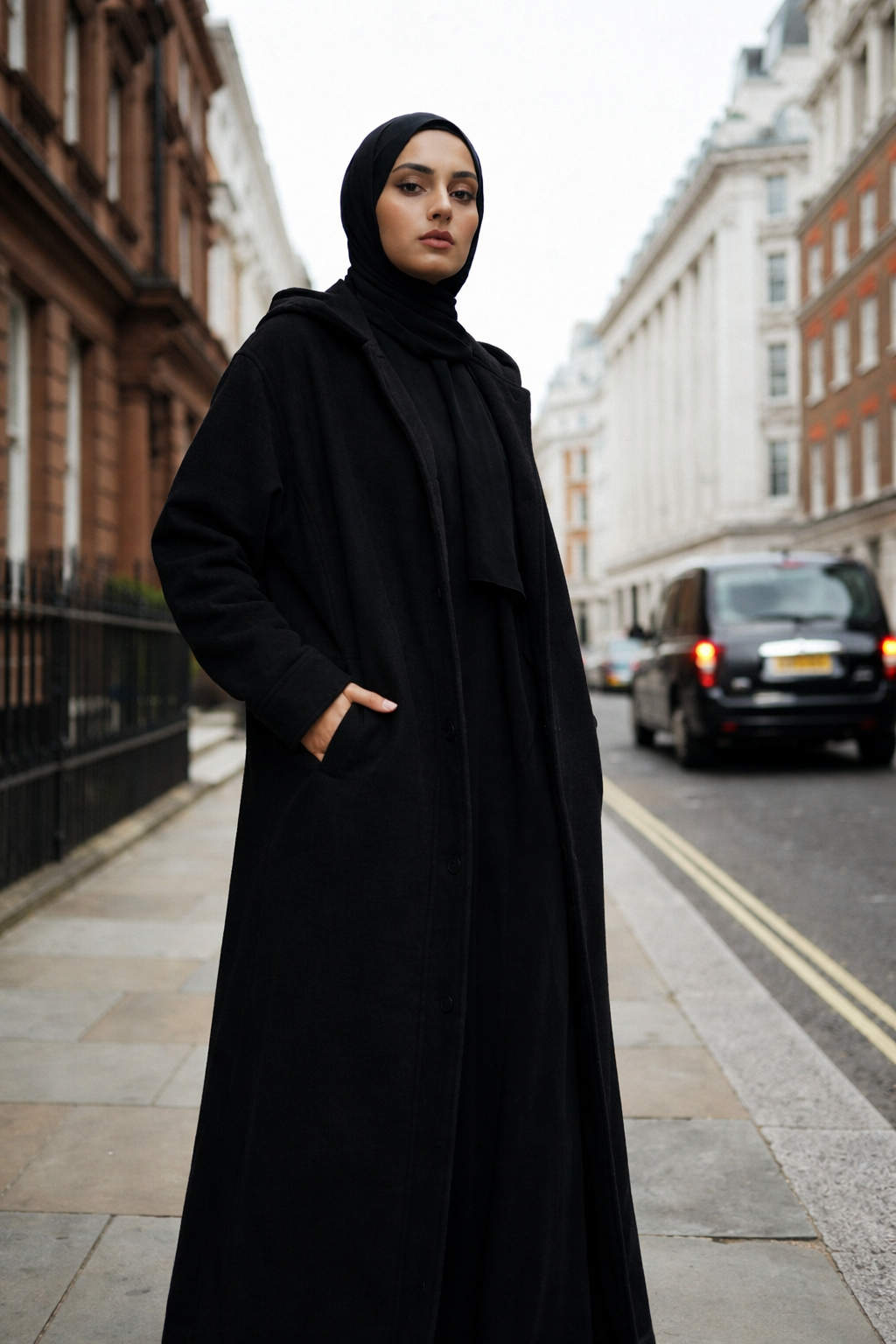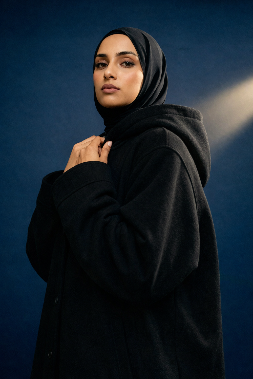 Our Winter Wool Hooded Longline Jacket is cut in an intentionally oversized, longline shape with a large hood for that cosy, cocooned feel. Wear it belted to define the waist and sharpen the look, or leave it loose for an effortless, slouchy drape that layers beautifully over knit dresses, abayas, and everyday basics.