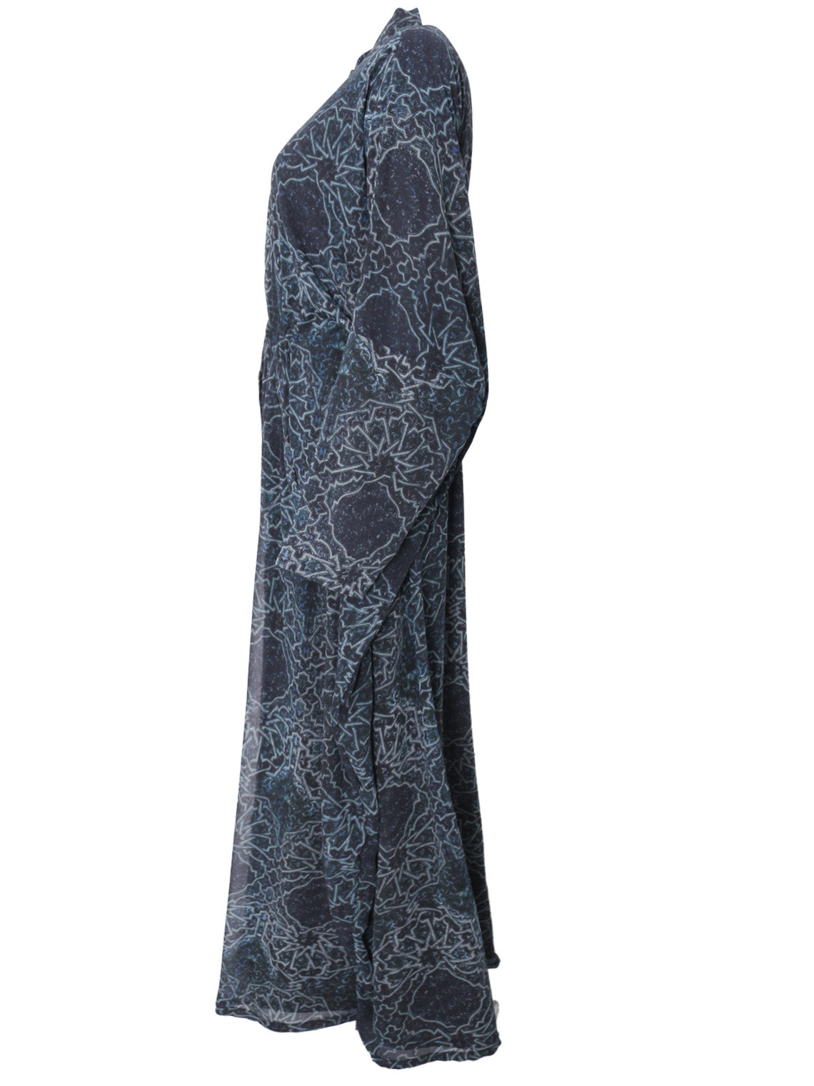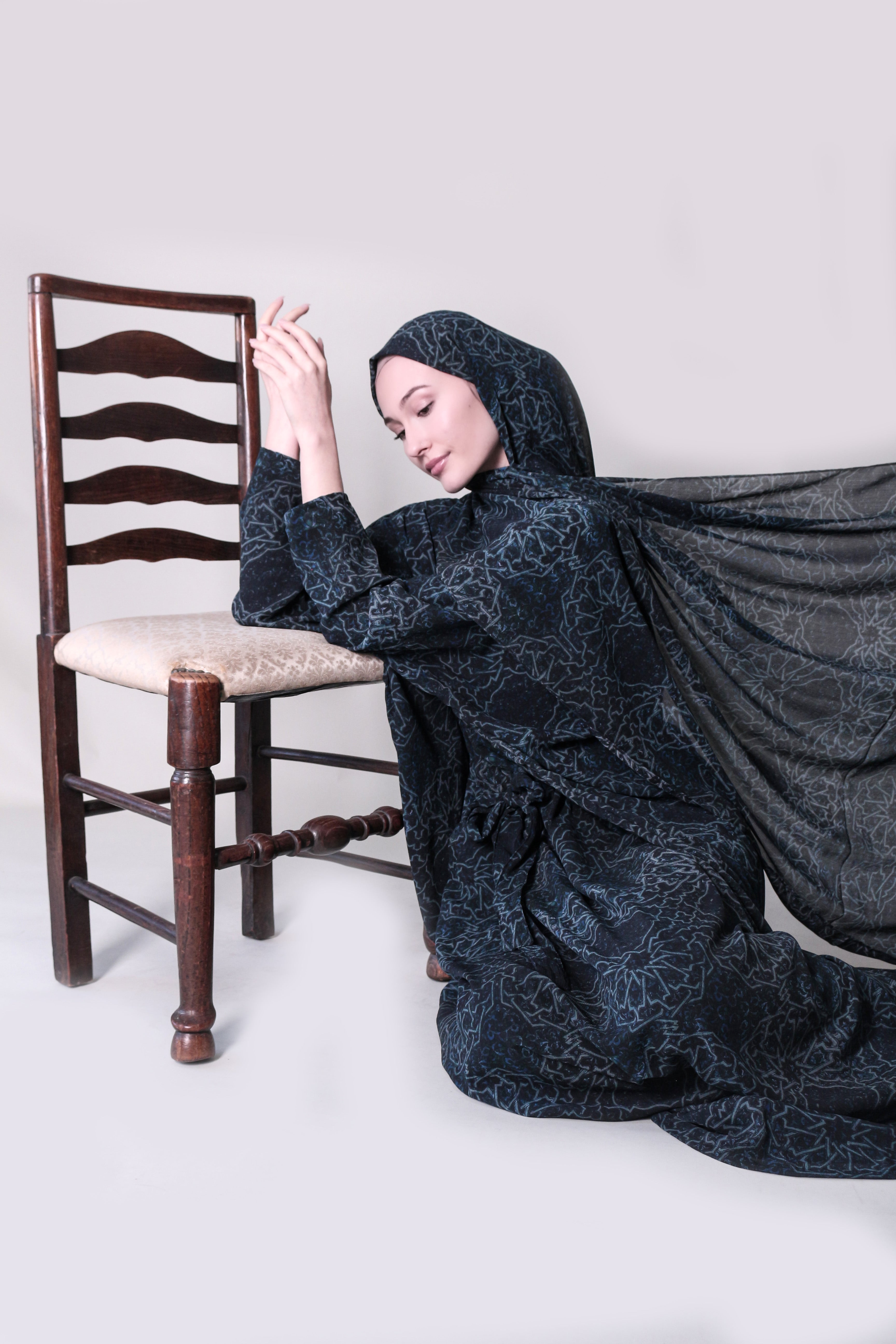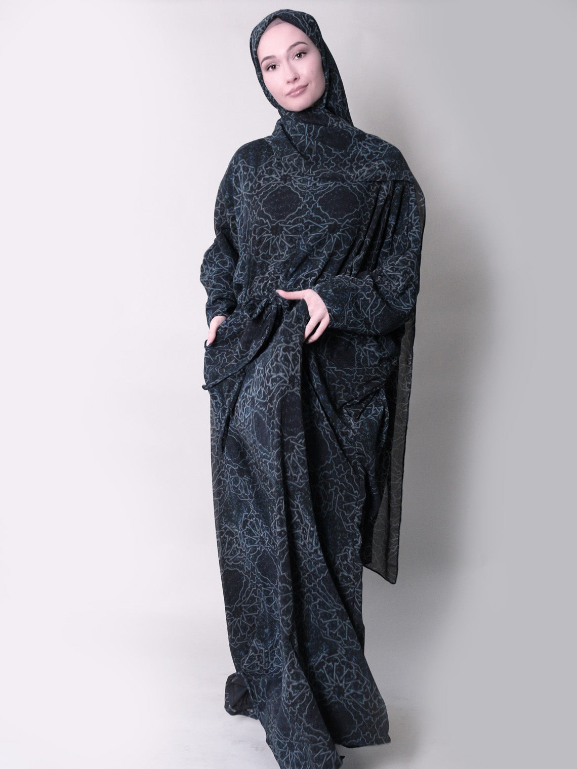 This kaftan takes our architectural Haykal print, those fine teal lines over deep charcoal and puts it in the easiest silhouette possible. No belt, no fuss, just slip it on and you're ready.