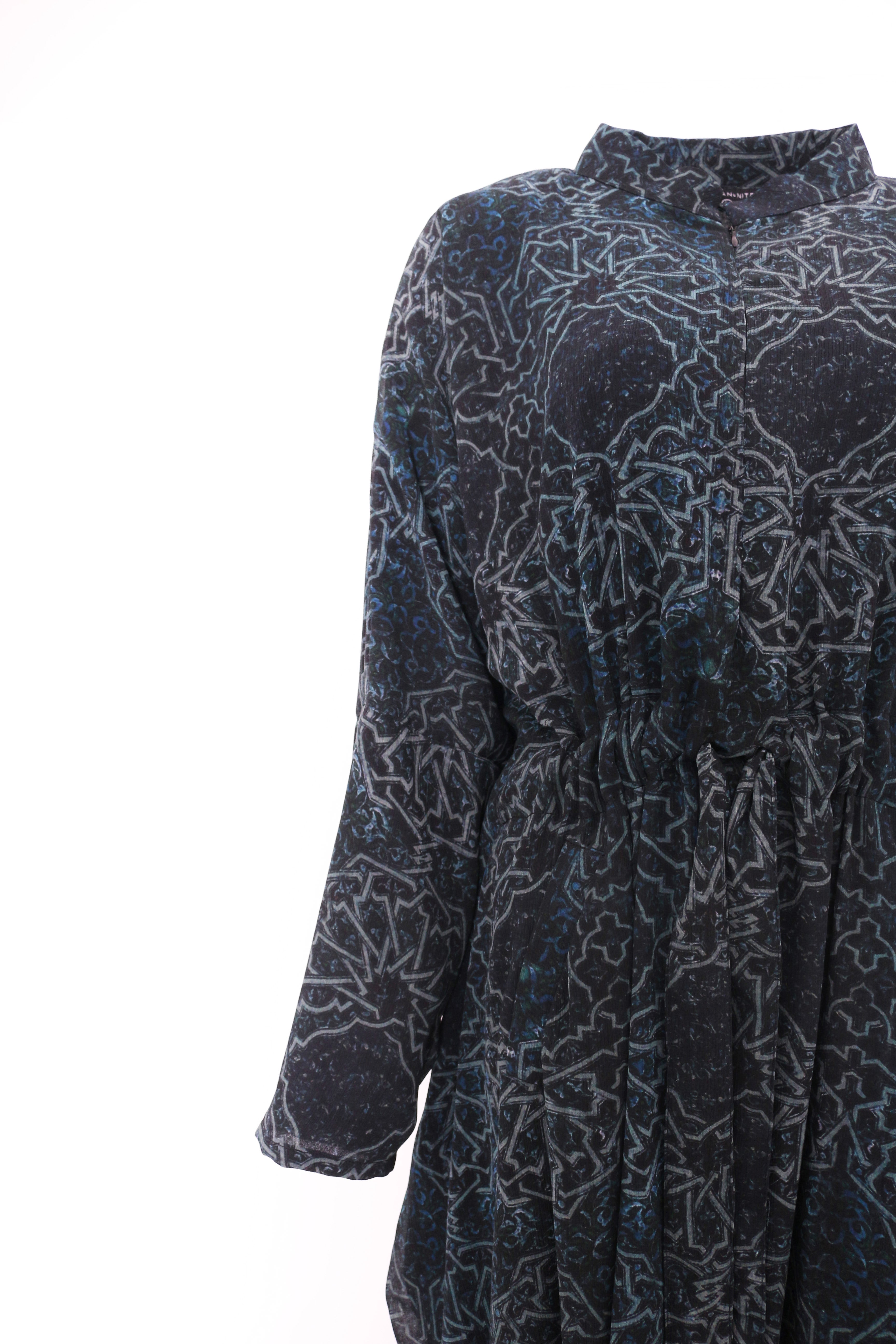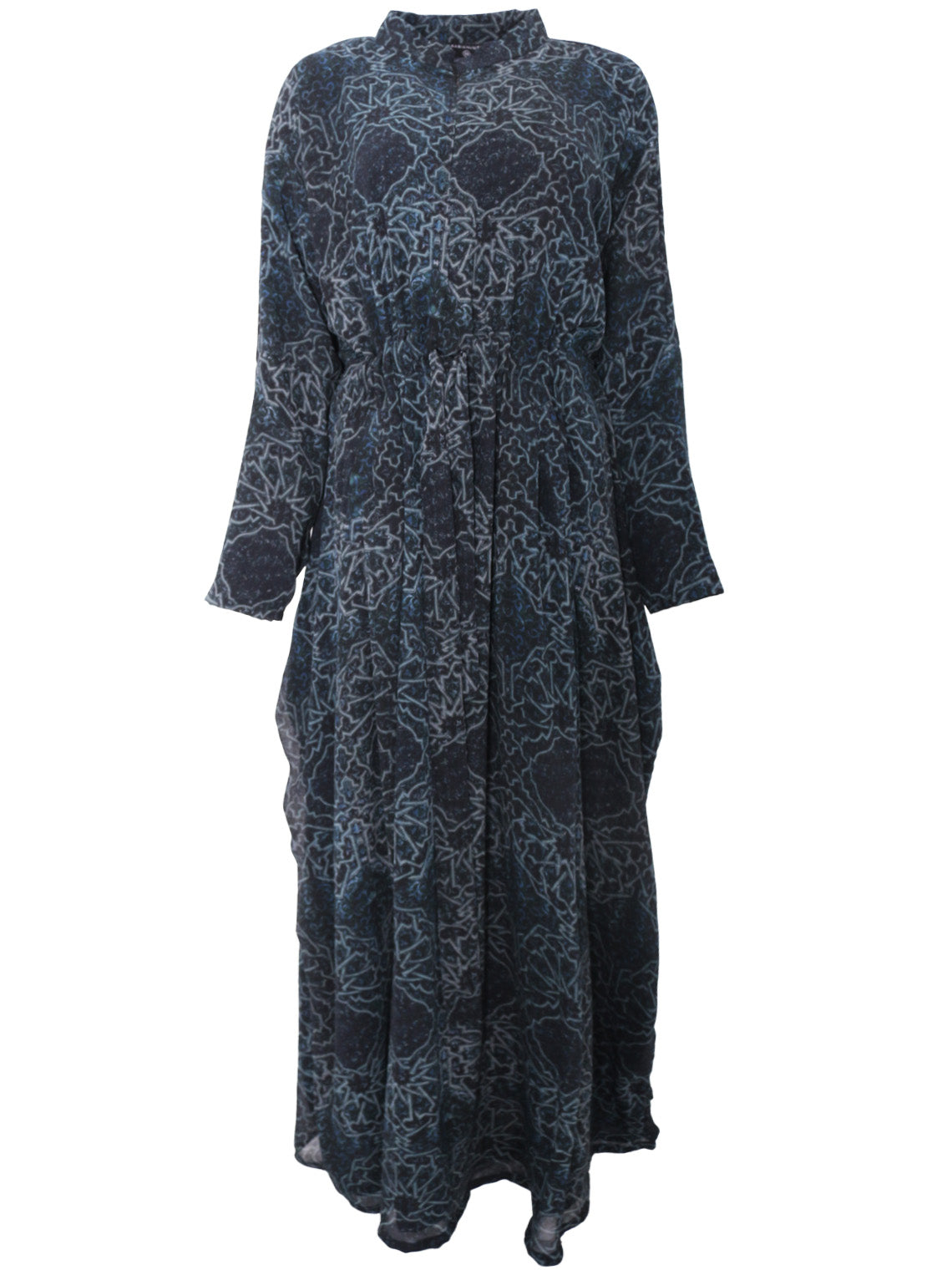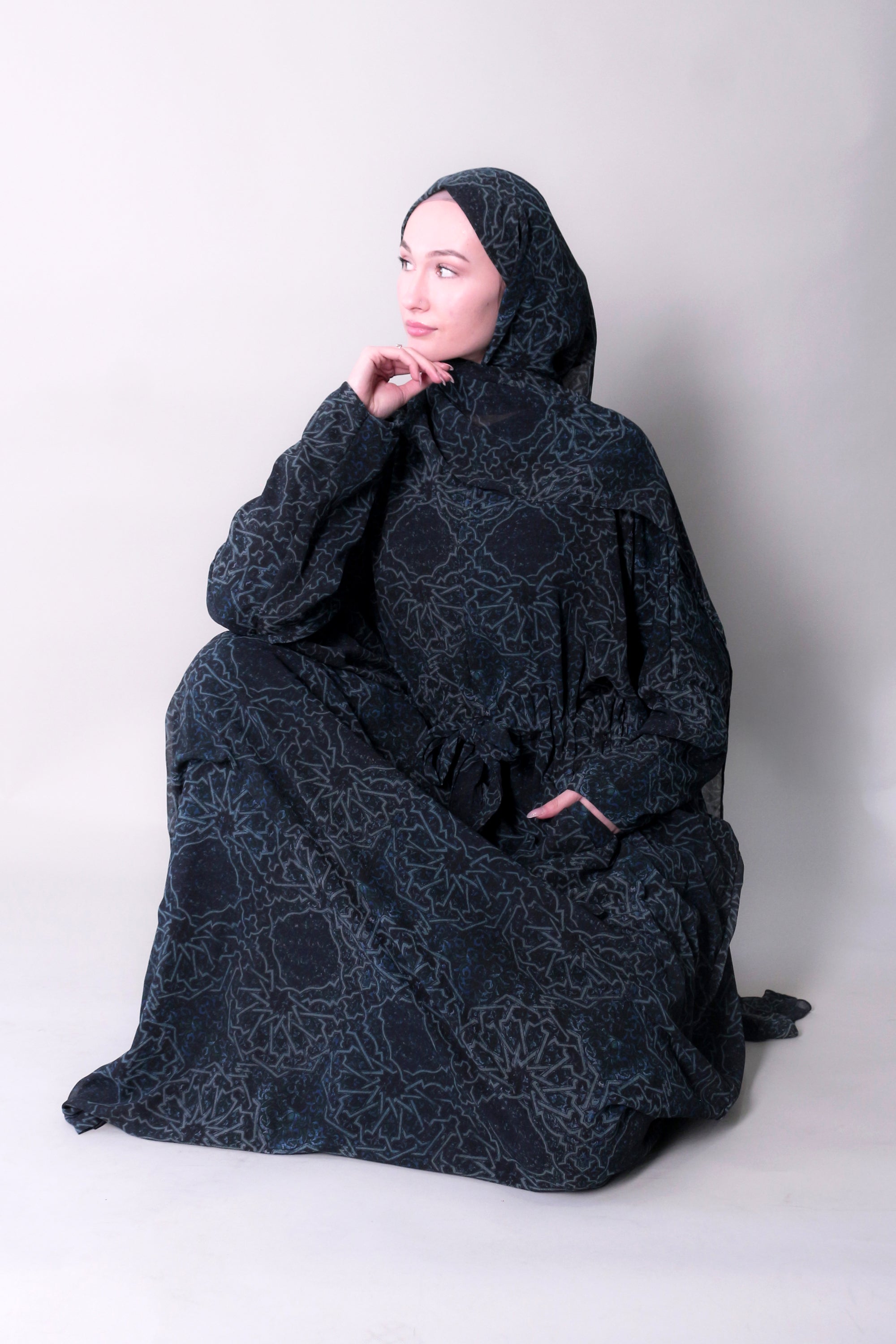 This kaftan takes our architectural Haykal print, those fine teal lines over deep charcoal and puts it in the easiest silhouette possible. No belt, no fuss, just slip it on and you're ready.
