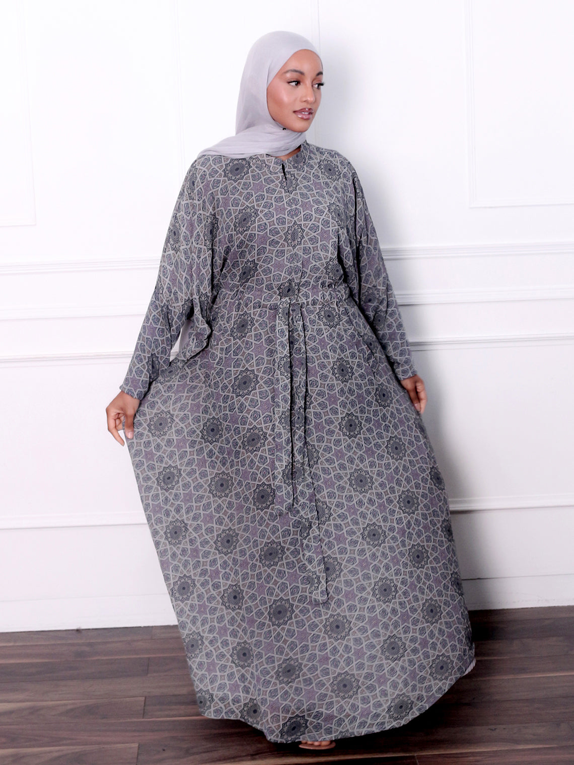 The details Premium chiffon · Mihrab all-over geometric print · Fully lined · Front zip · Adjustable pull-string waist · Side pockets