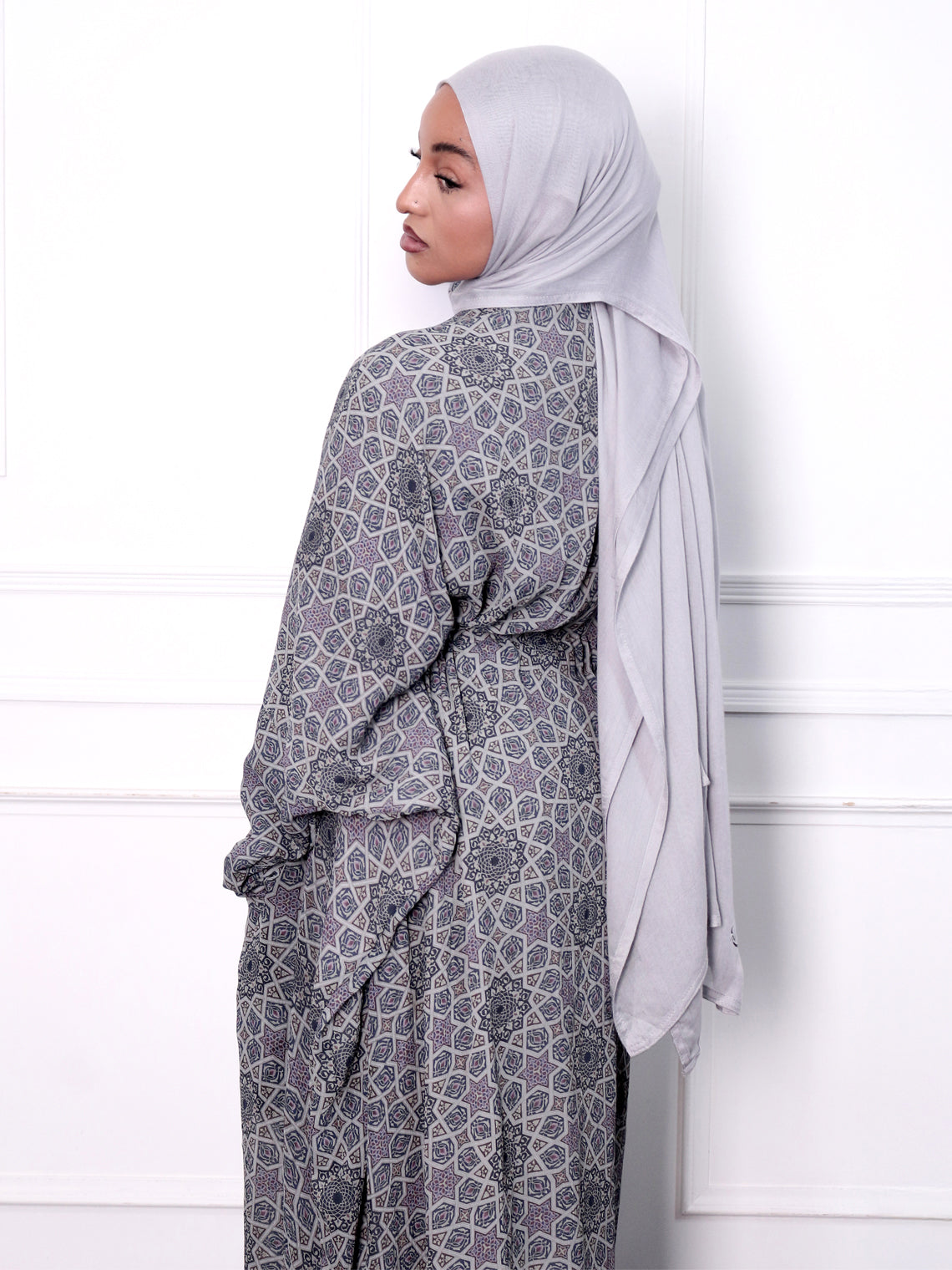 The Mihrab print draws from the intricate tilework of Islamic sacred spaces. Centuries of craft, compressed into a single, all-over motif that moves across this fluid chiffon with quiet authority. Muted and considered in its palette, it is the kind of print that reveals more the longer you look.