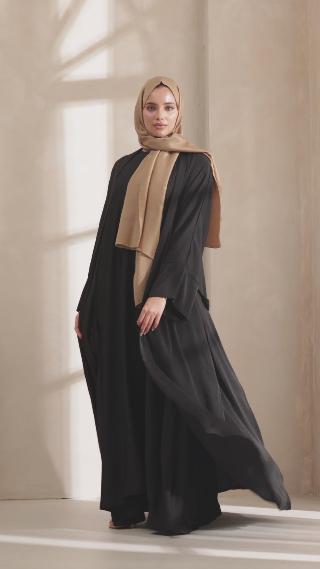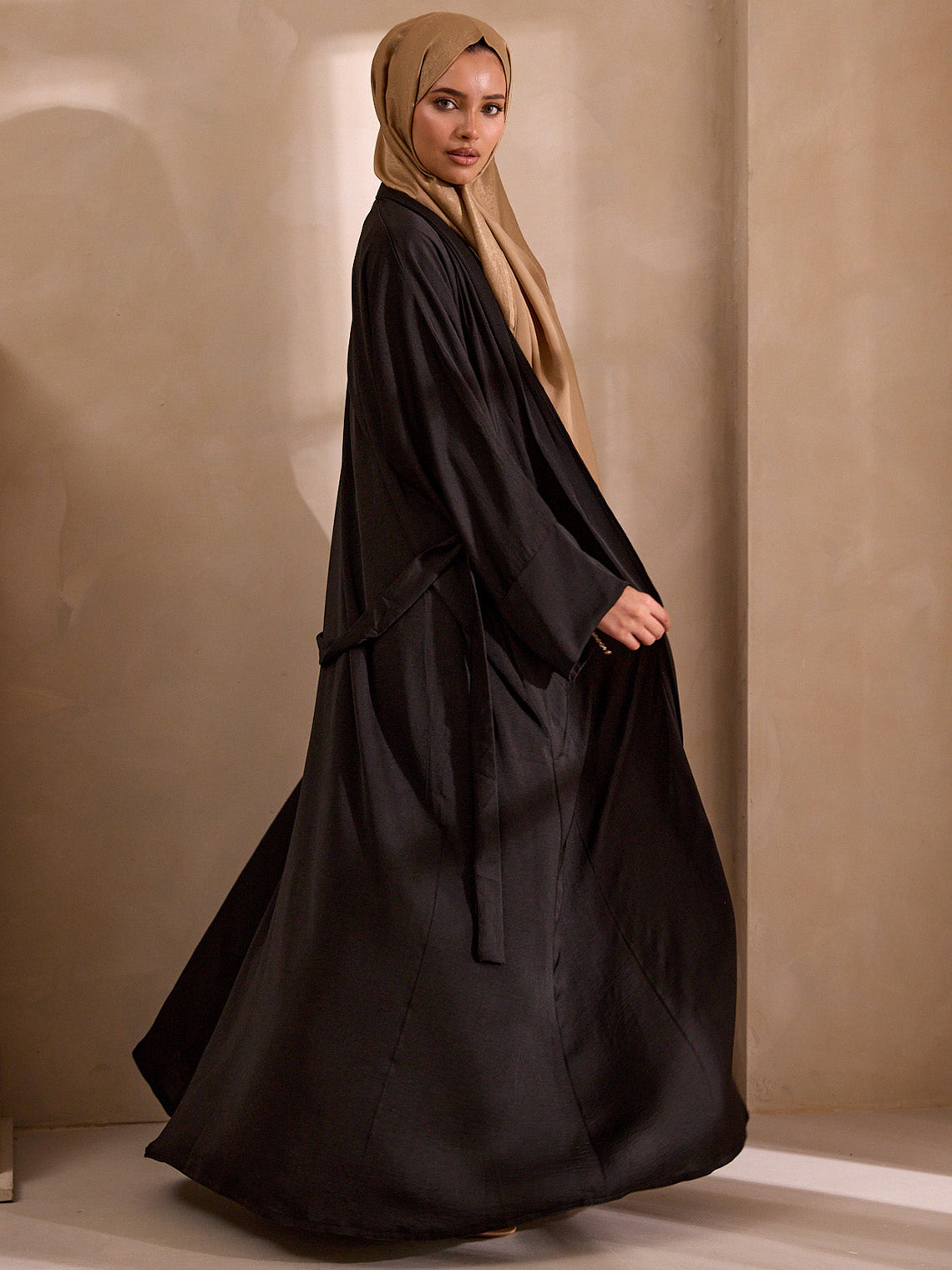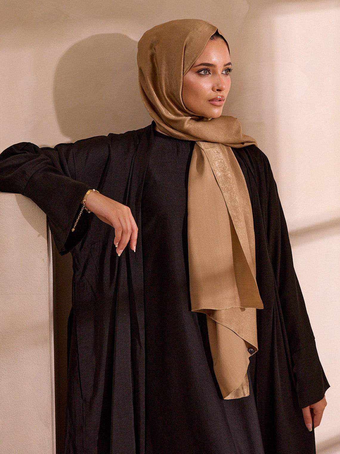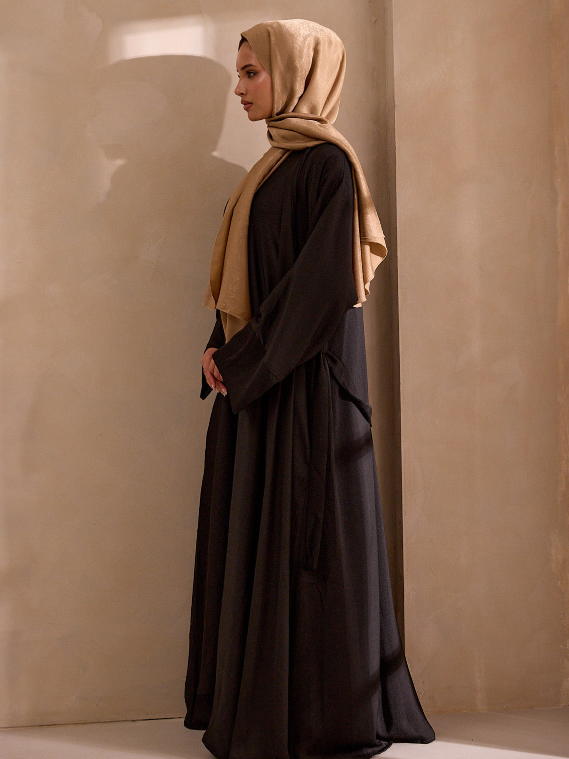 Wear it Over everything, but best styled with the matching Hareer Abaya. A warm-toned hijab — camel, gold, or sand — lets the black speak for itself.