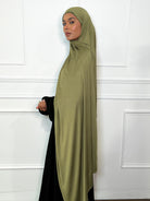 Our instant jersey hijab is made from a stretchy, soft jersey fabric. It is designed to be easy to wear, with no need for pins or complicated wrapping techniques. The hijab is pre-sewn to fit around your face, so all you have to do is slide it on. It is perfect for busy women on the go who want to look stylish without spending a lot of time on their hijab. The high-quality material is comfortable, practical, and non-see-through, ensuring you look your best all day long. The instant jersey hijab is ideal for warm days, as it allows good airflow and excellent comfort due to its lightness. Great to workout out in too.