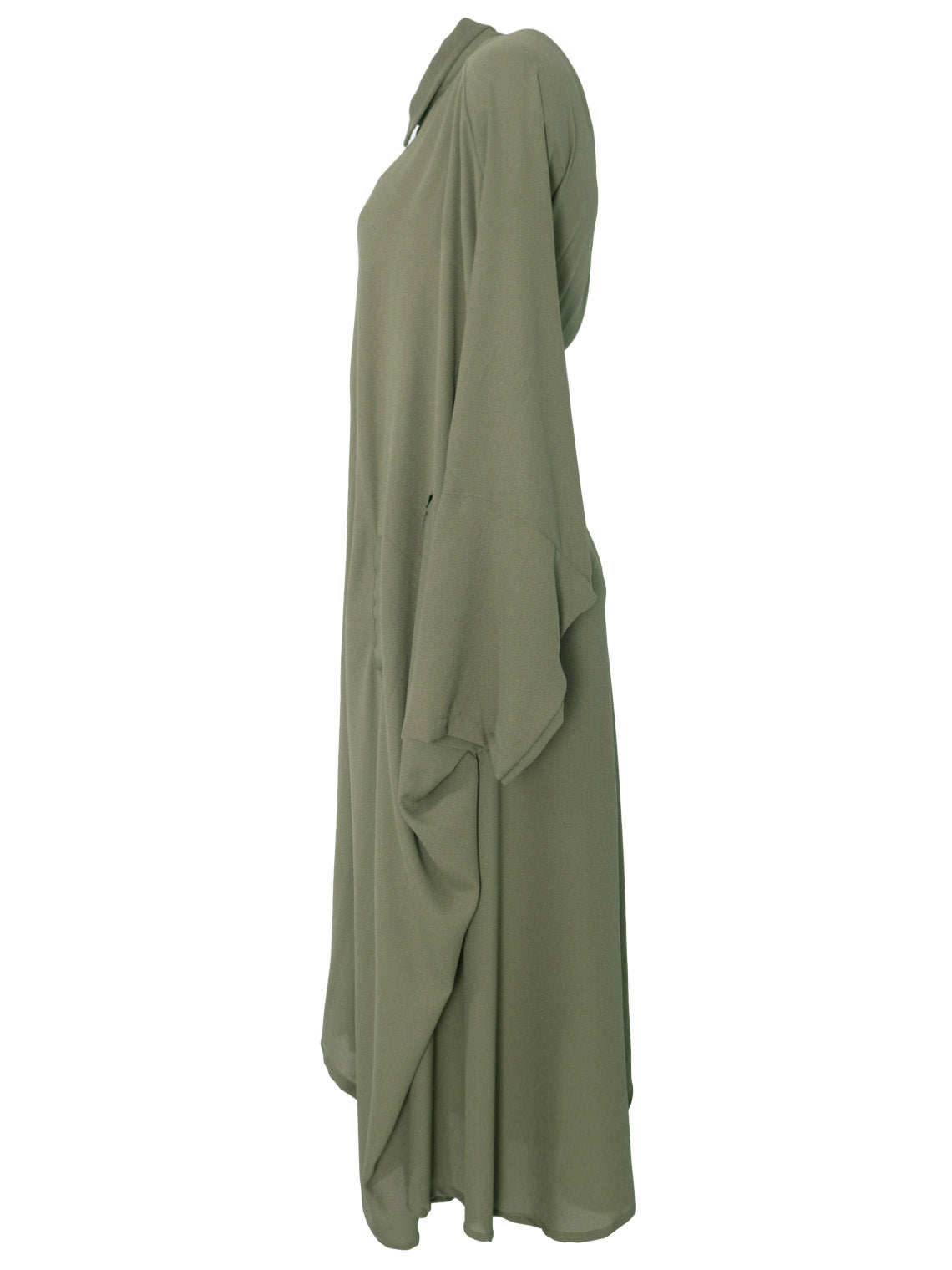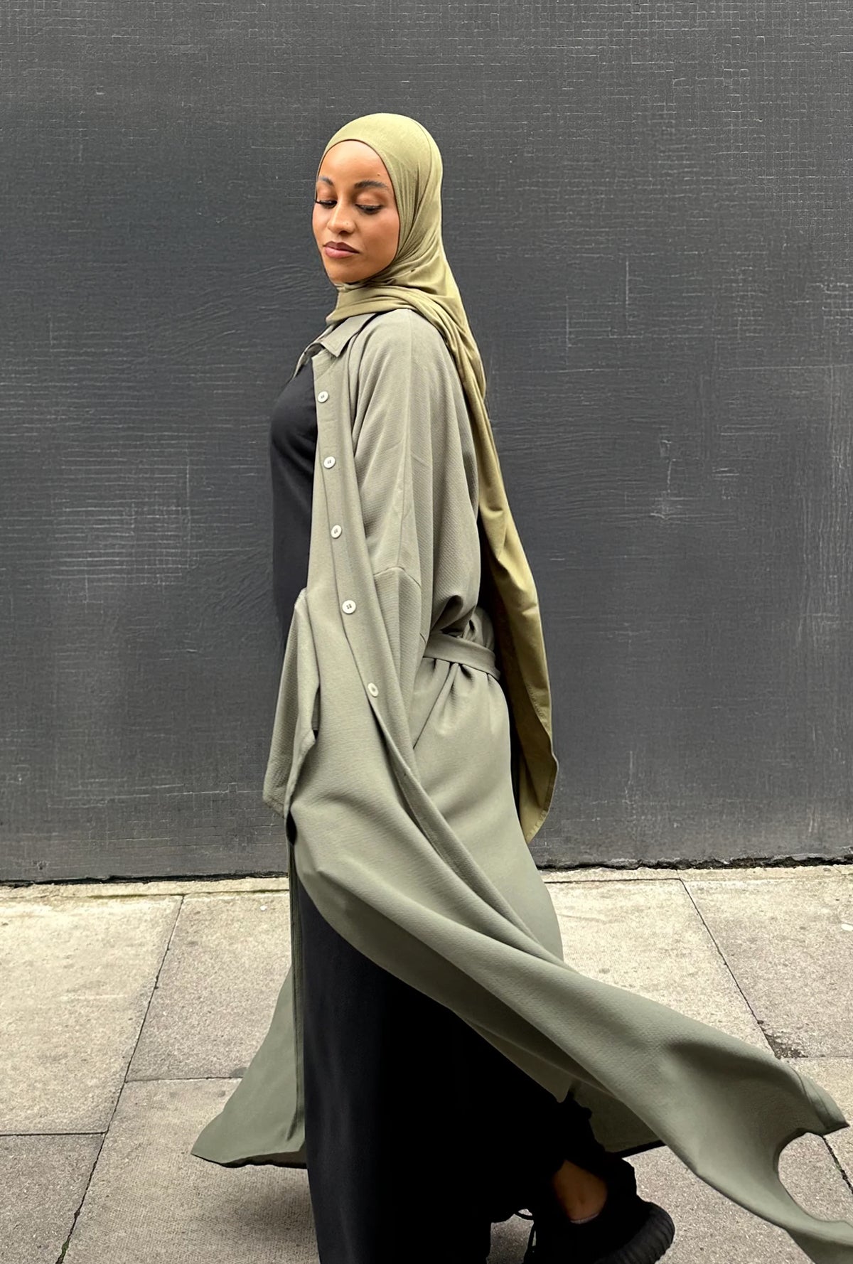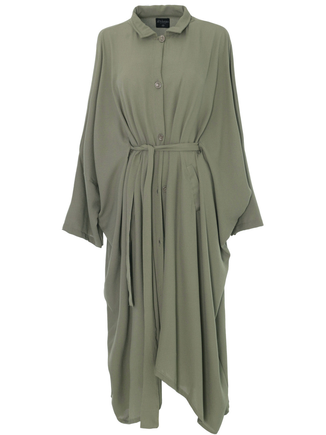 This khaki bedouin kaftan features a detachable belt, allowing versatile styling options: cinch it at the front, knot it at the back for an elegant shape, or leave it belt-free for a relaxed drape. The button-down front offers a polished touch, ideal for wearing closed for sophistication or open as a graceful layering piece. A garment that effortlessly complements your mood, personal style, and any occasion.