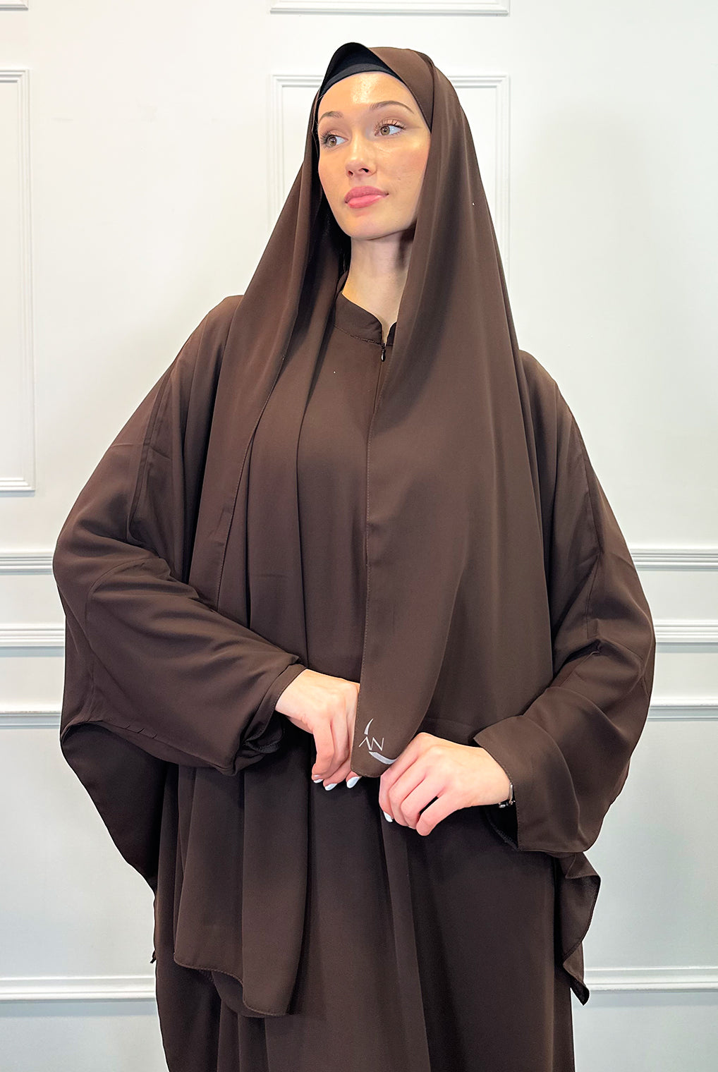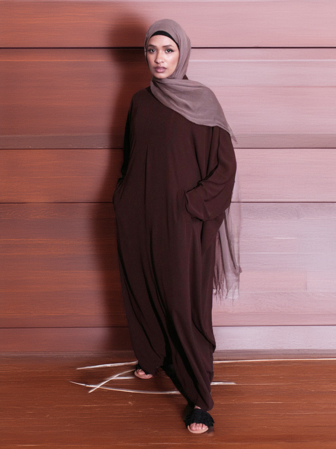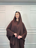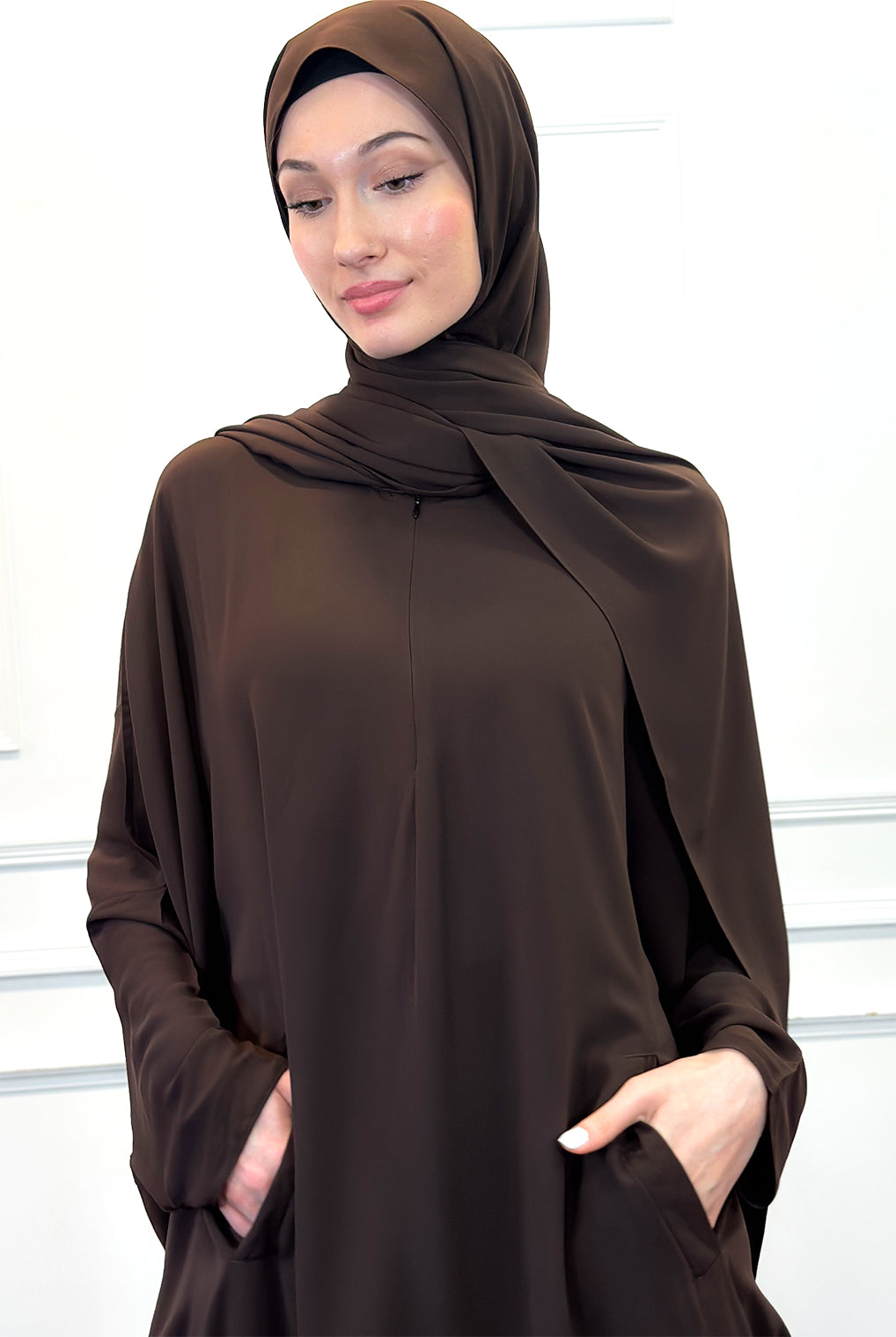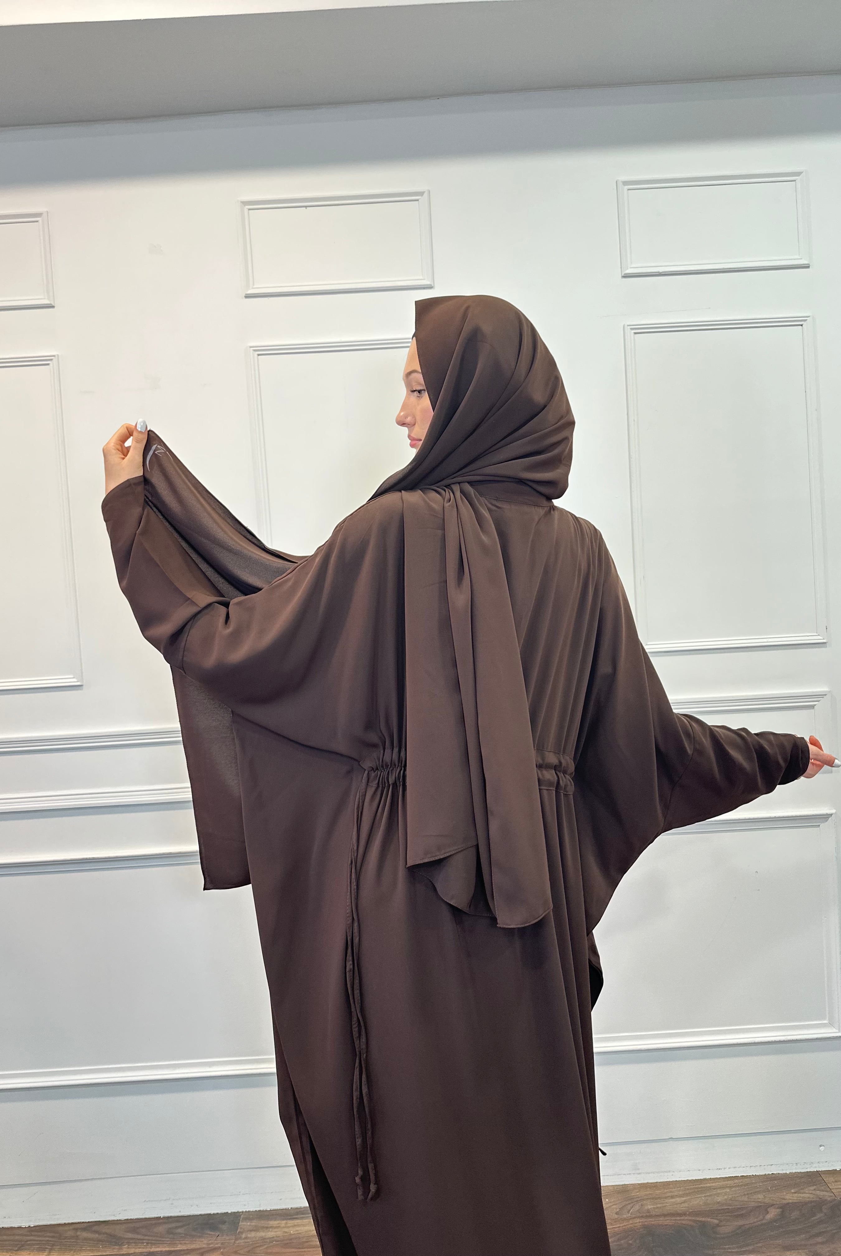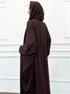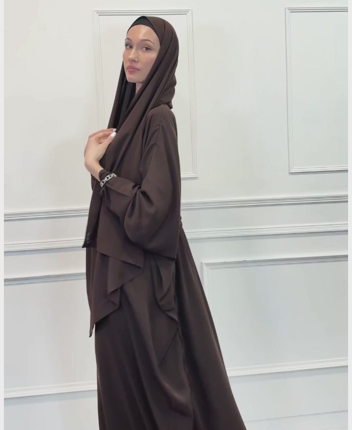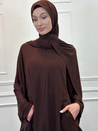 Introducing this season's must-have kaftan in a rich mocha shade. Crafted with a luxurious satin-like texture, it offers effortless comfort and ease of movement for daily wear. Designed with a front zip and an adjustable drawstring at the back to gently cinch the waist while keeping the front gracefully relaxed. Complete the look with a coordinating scarf, available separately.