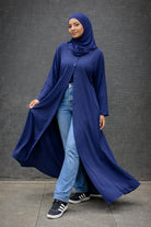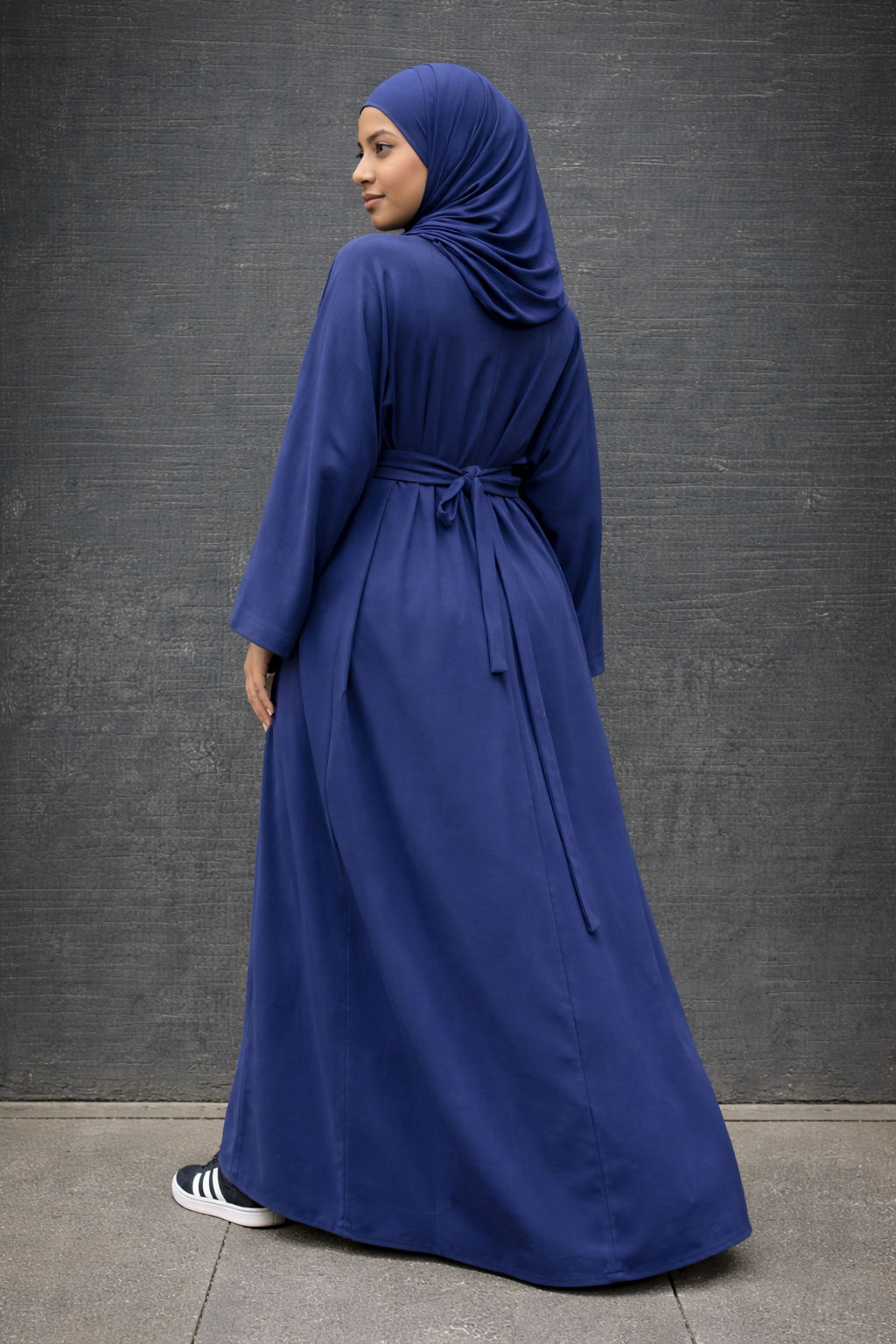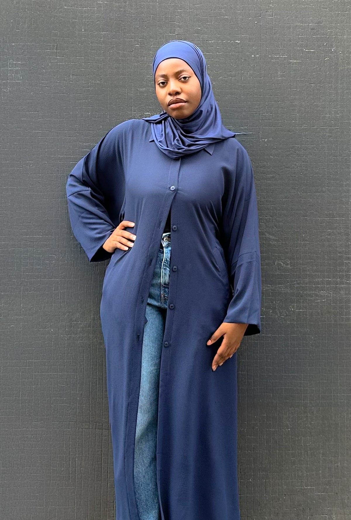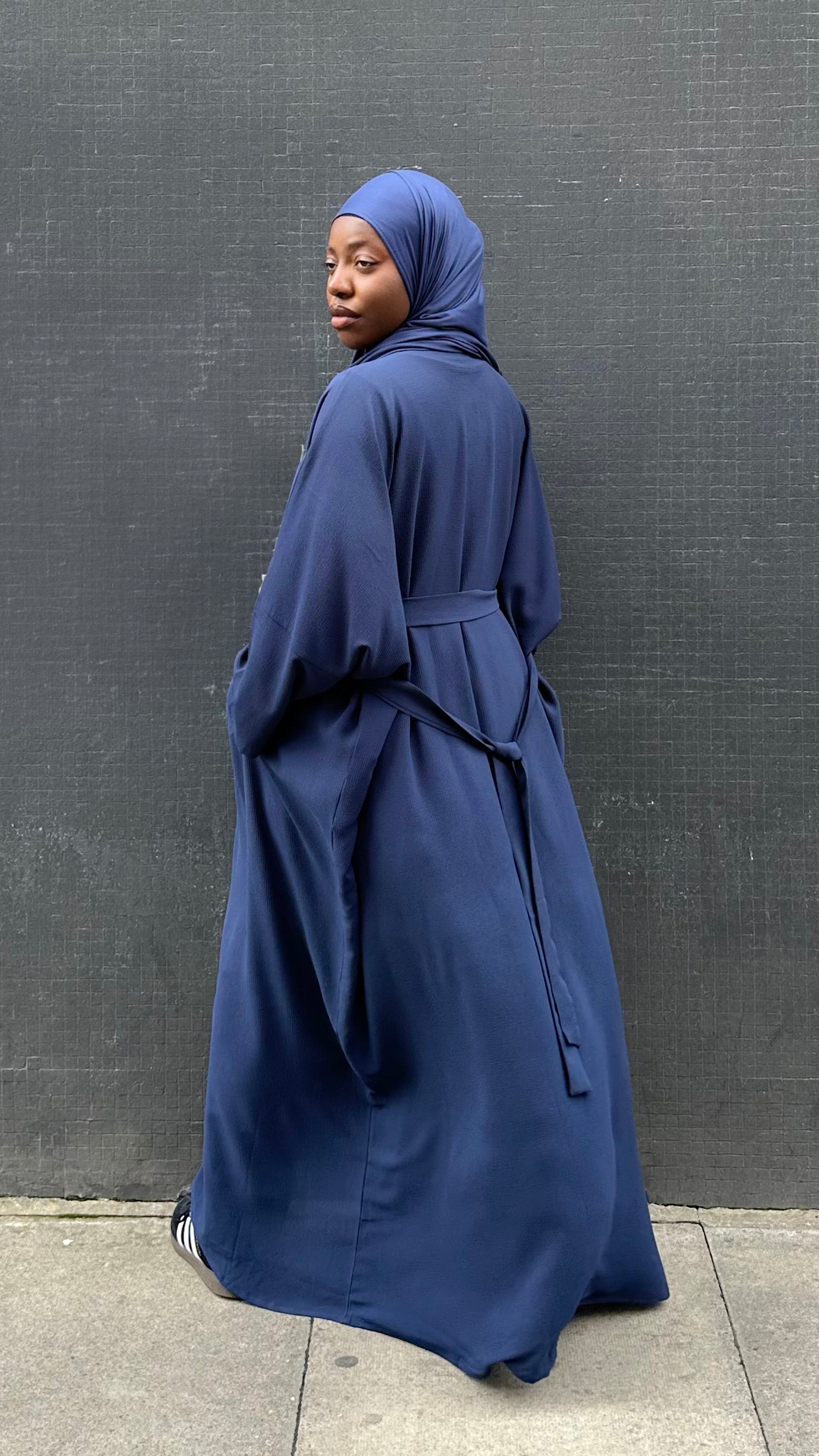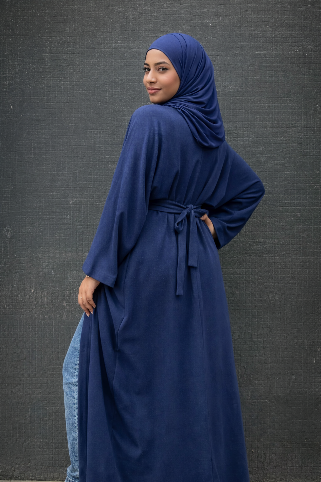 This navy kaftan features a detachable belt, allowing versatile styling options: cinch it at the front, knot it at the back for an elegant shape, or leave it off for a graceful, free-flowing fit. The button-down front offers a sophisticated touch, ideal for a sleek closed look or an easygoing open layer. A garment that seamlessly complements your mood, style, and any event.