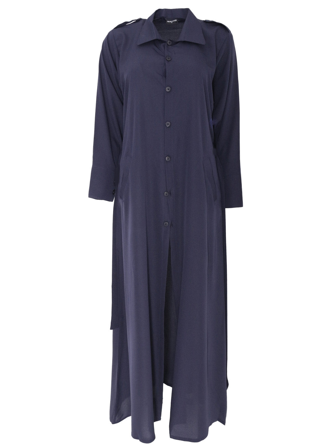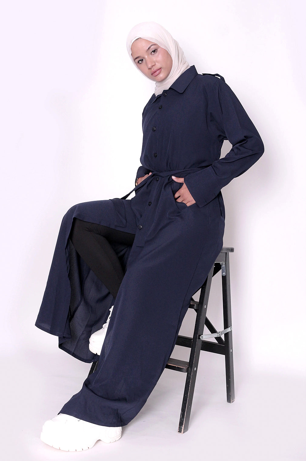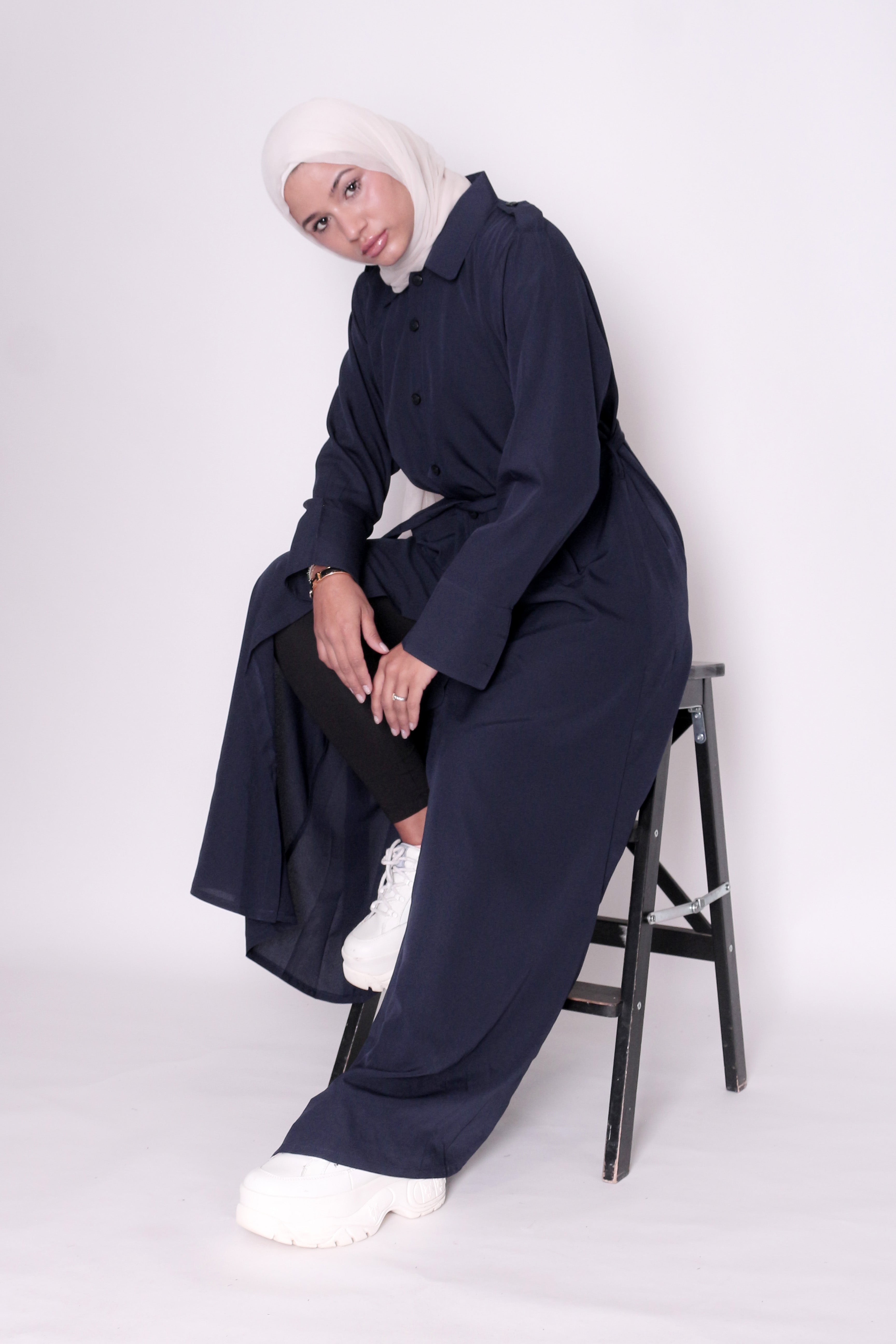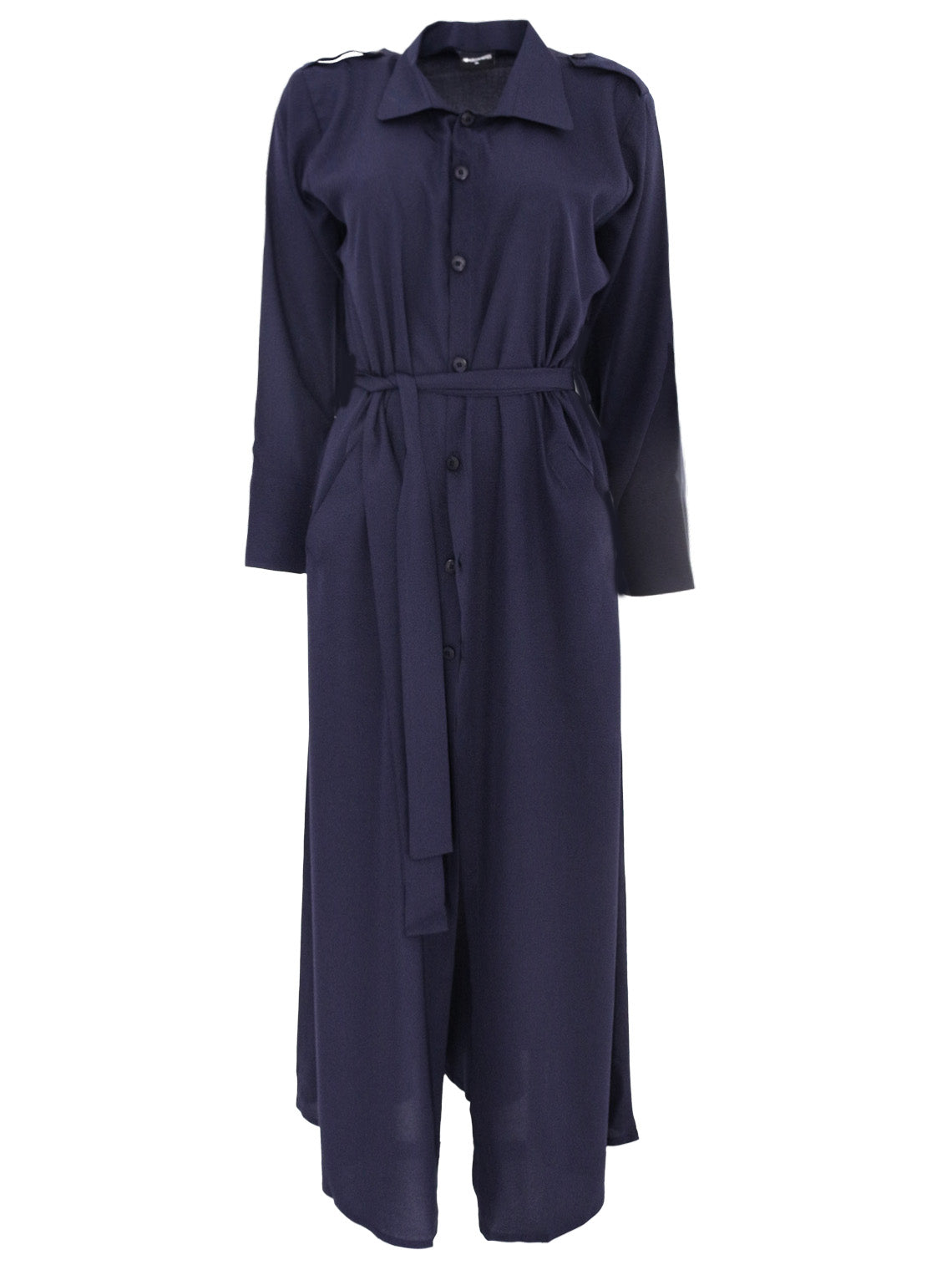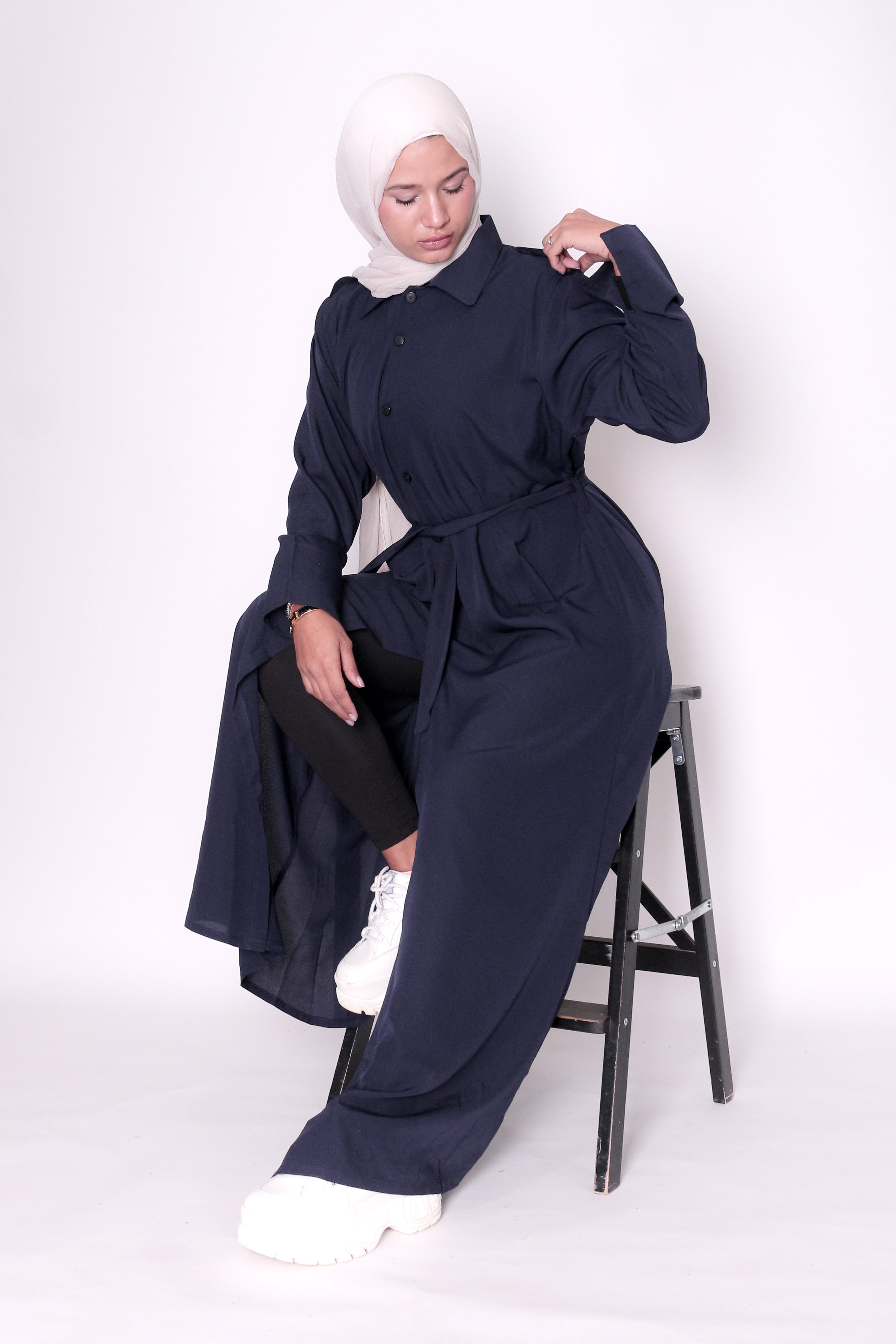 Unlock endless styling potential with this navy Bedouin shirt jacket—crafted for those who demand flexibility without sacrificing sophistication. The removable belt puts you in control: wear it cinched at the front for a sharp, sculpted silhouette, tie it at the back for refined elegance, or skip it altogether for an unstructured, flowing aesthetic. The button-front design bends to your preference—fasten it for a polished, put-together look or leave it open for relaxed layering versatility. Complete the look with silver or gold jewellery for added glamour. One jacket, countless ways to wear it.