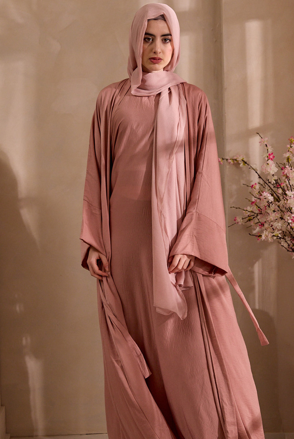 Persian Blush is the Hareer in its most romantic form, the same featherlight poly-silk blend, the same barely-there sheen, now in a colour that sits somewhere between rose and sand. A back pleat adds movement and fullness as it falls; wide sleeves and an open front give it an ease that is entirely effortless.