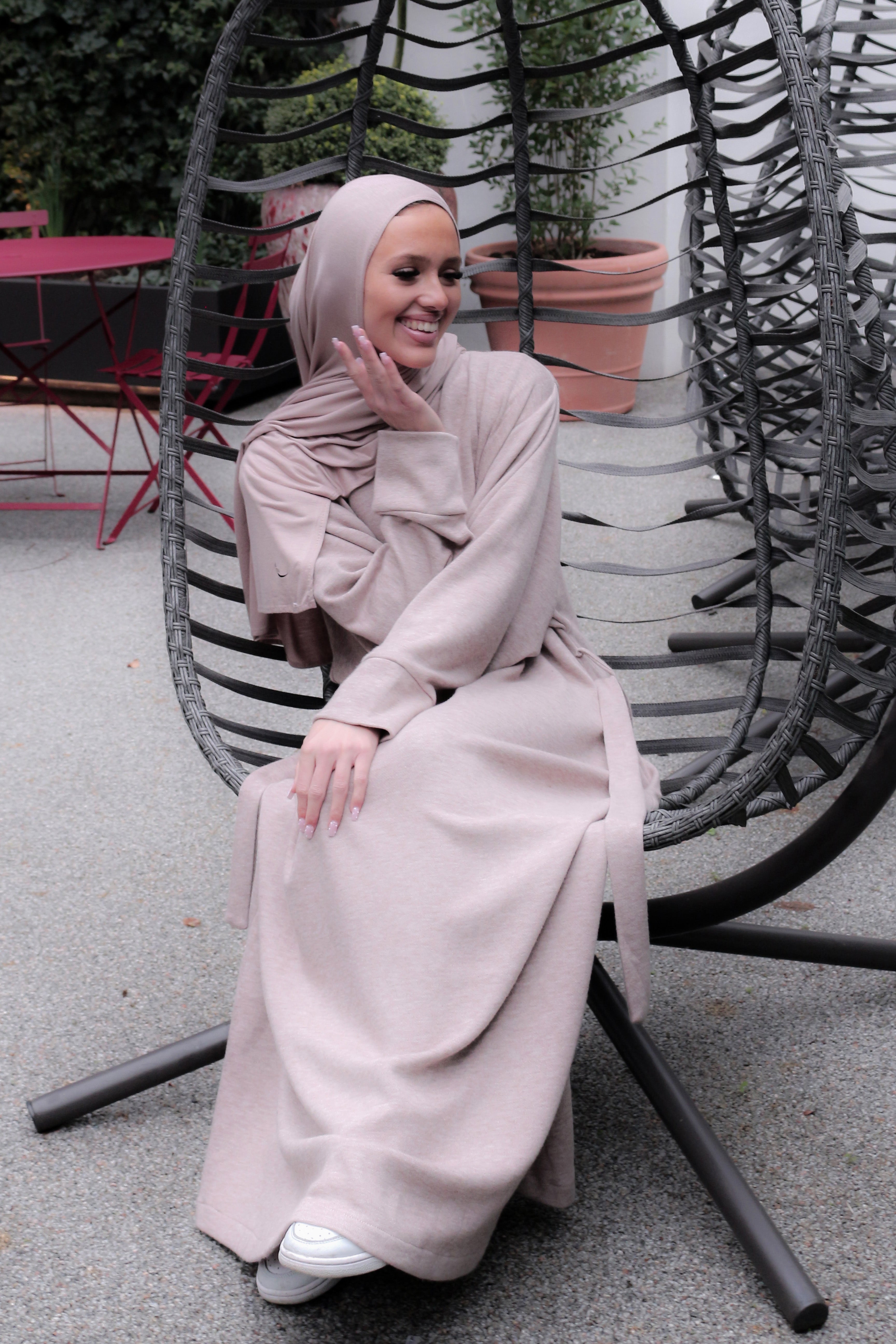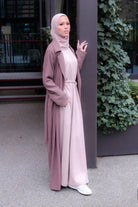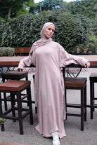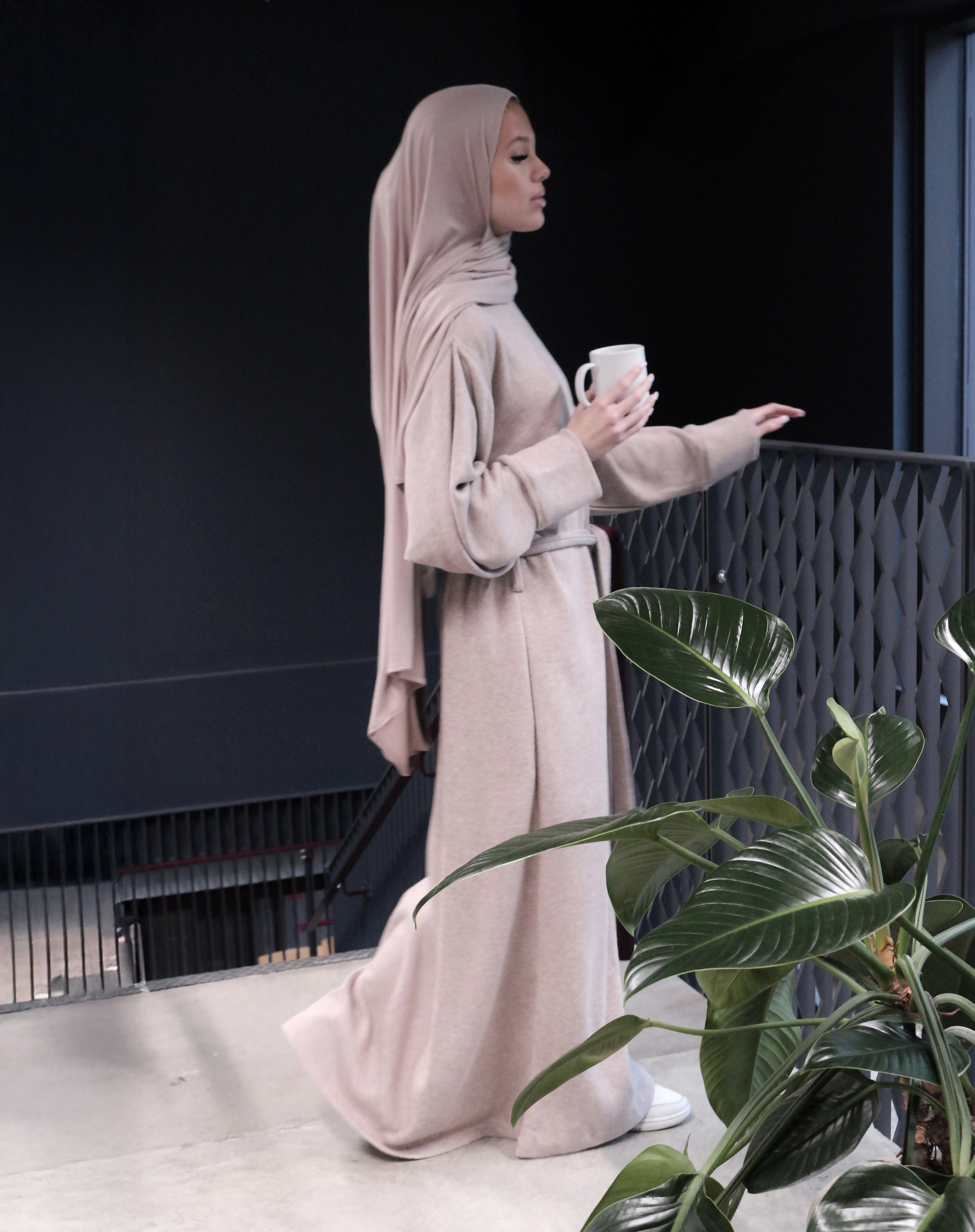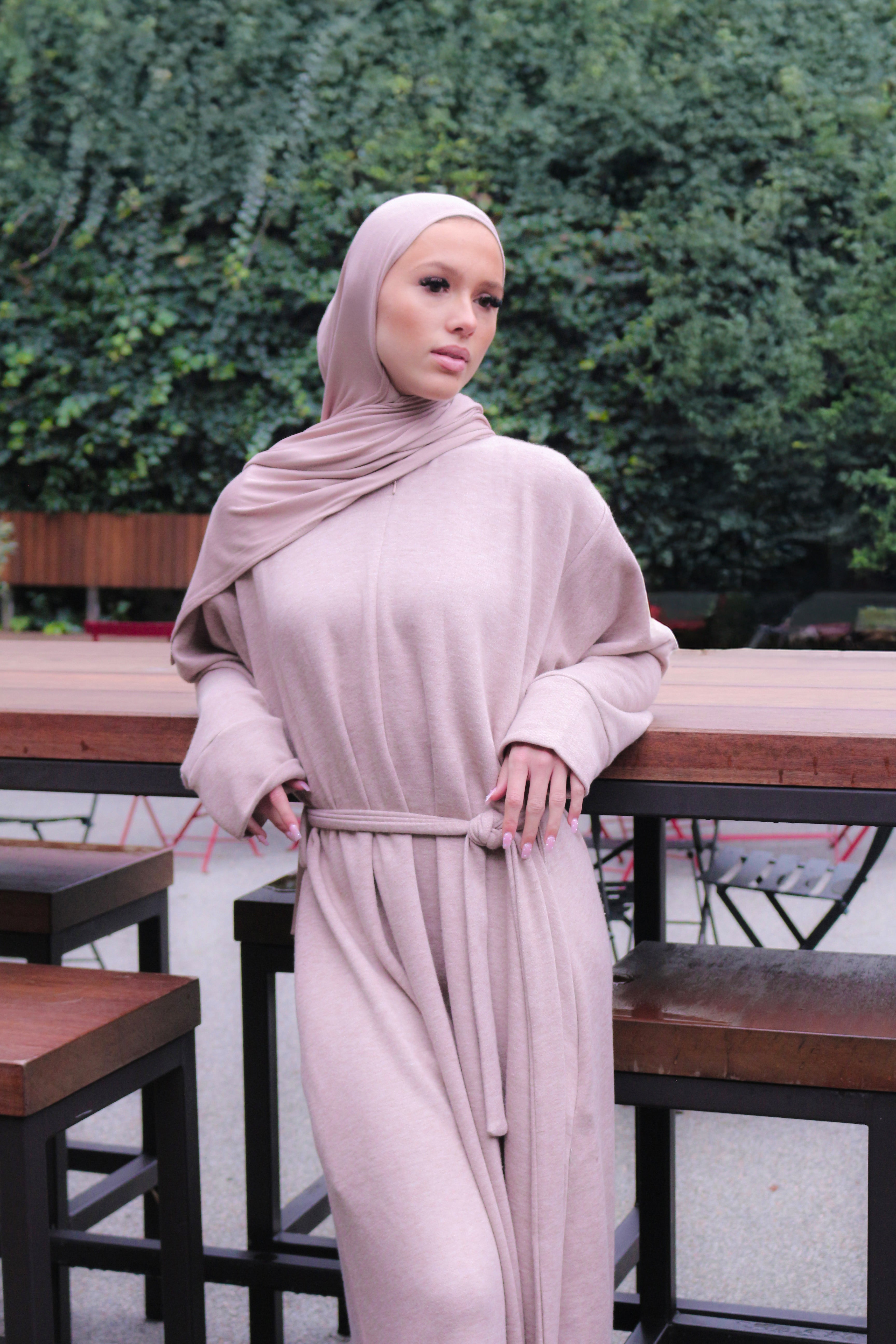Indulge in the ultimate comfort of this luxurious knit dress, crafted from sumptuous fabric that feels as soft as a cloud against your skin. The relaxed, flowing silhouette flatters effortlessly, whether you wear it solo or layered beneath an open abaya or jacket.